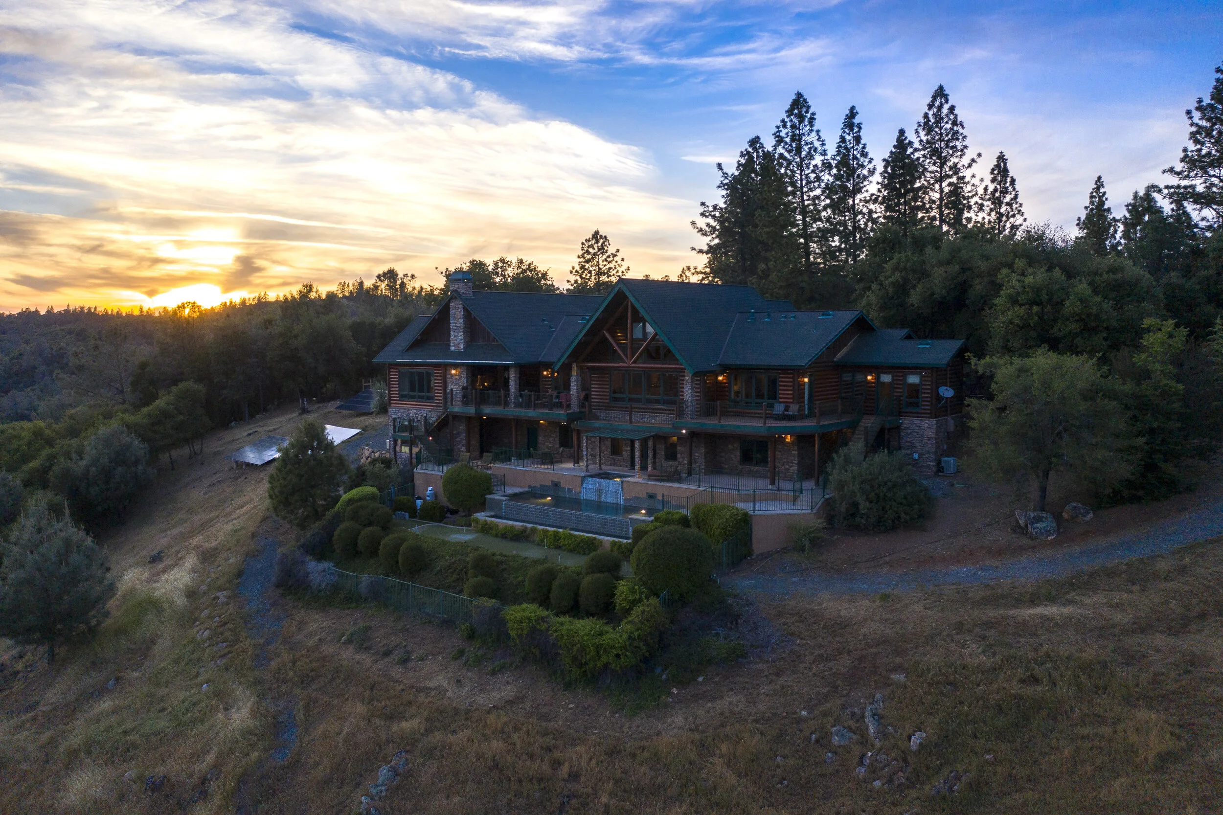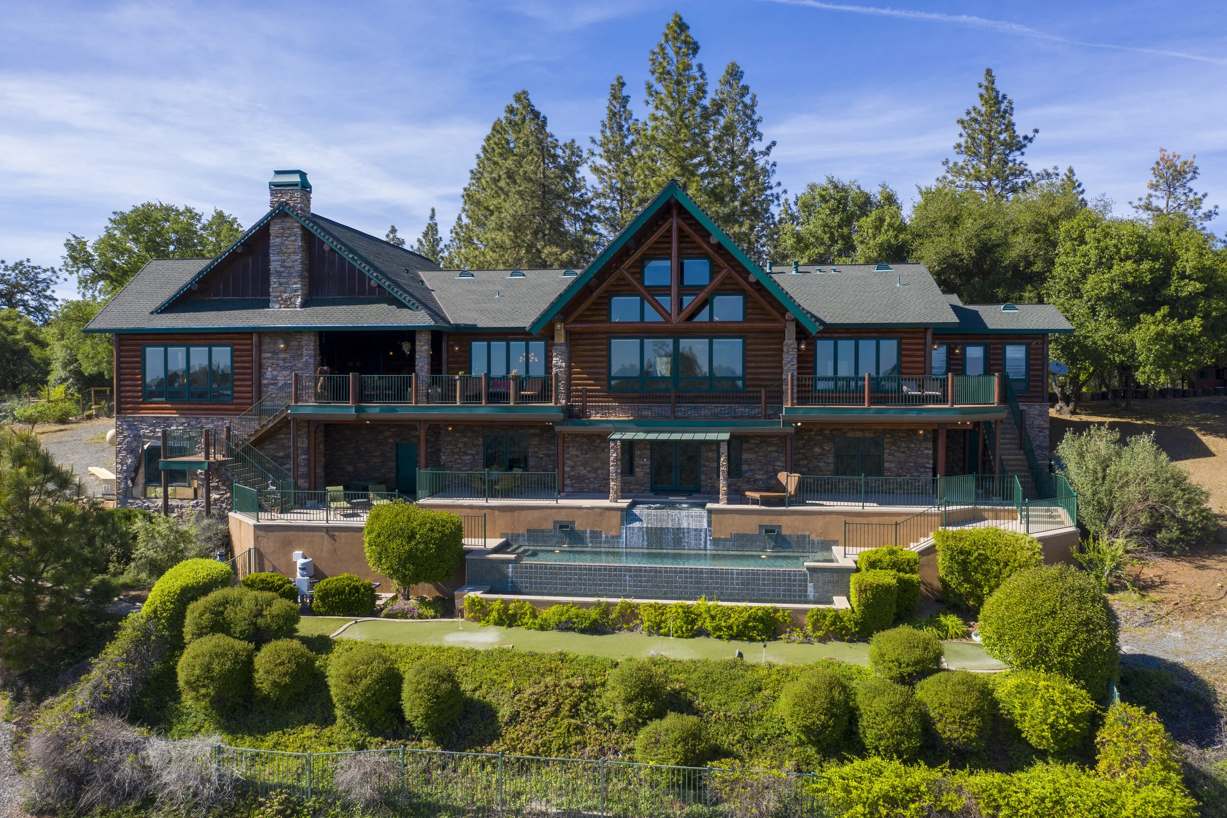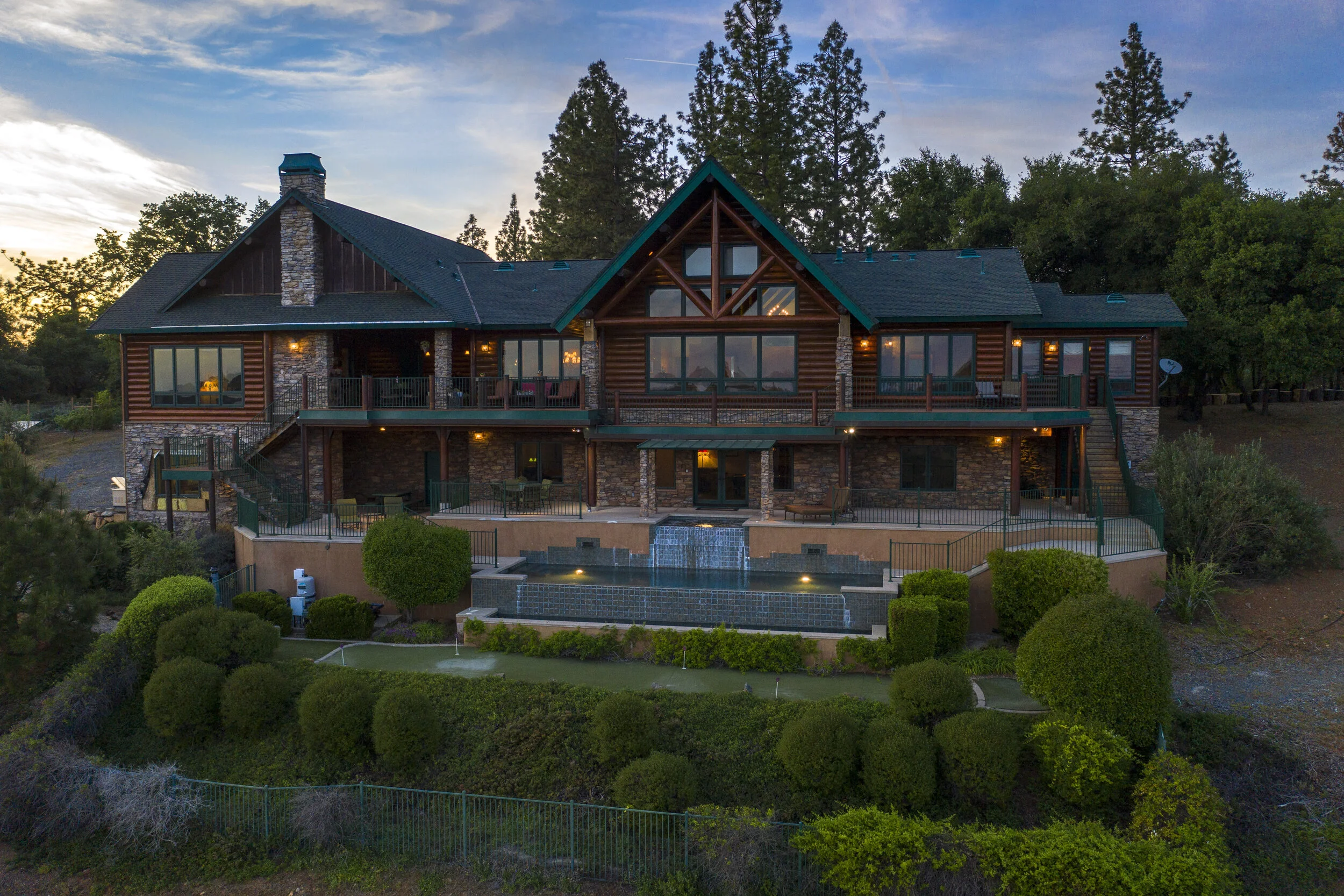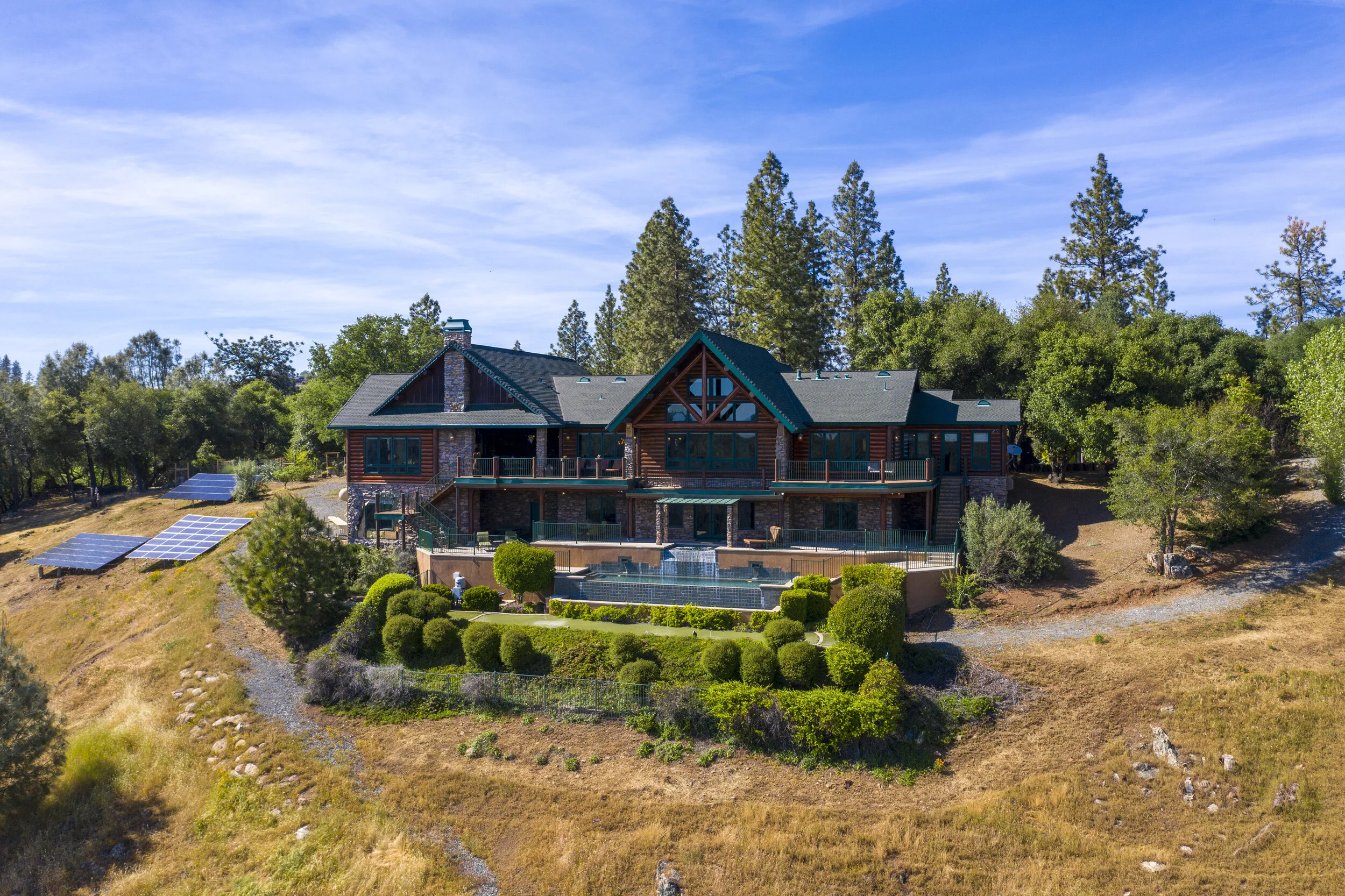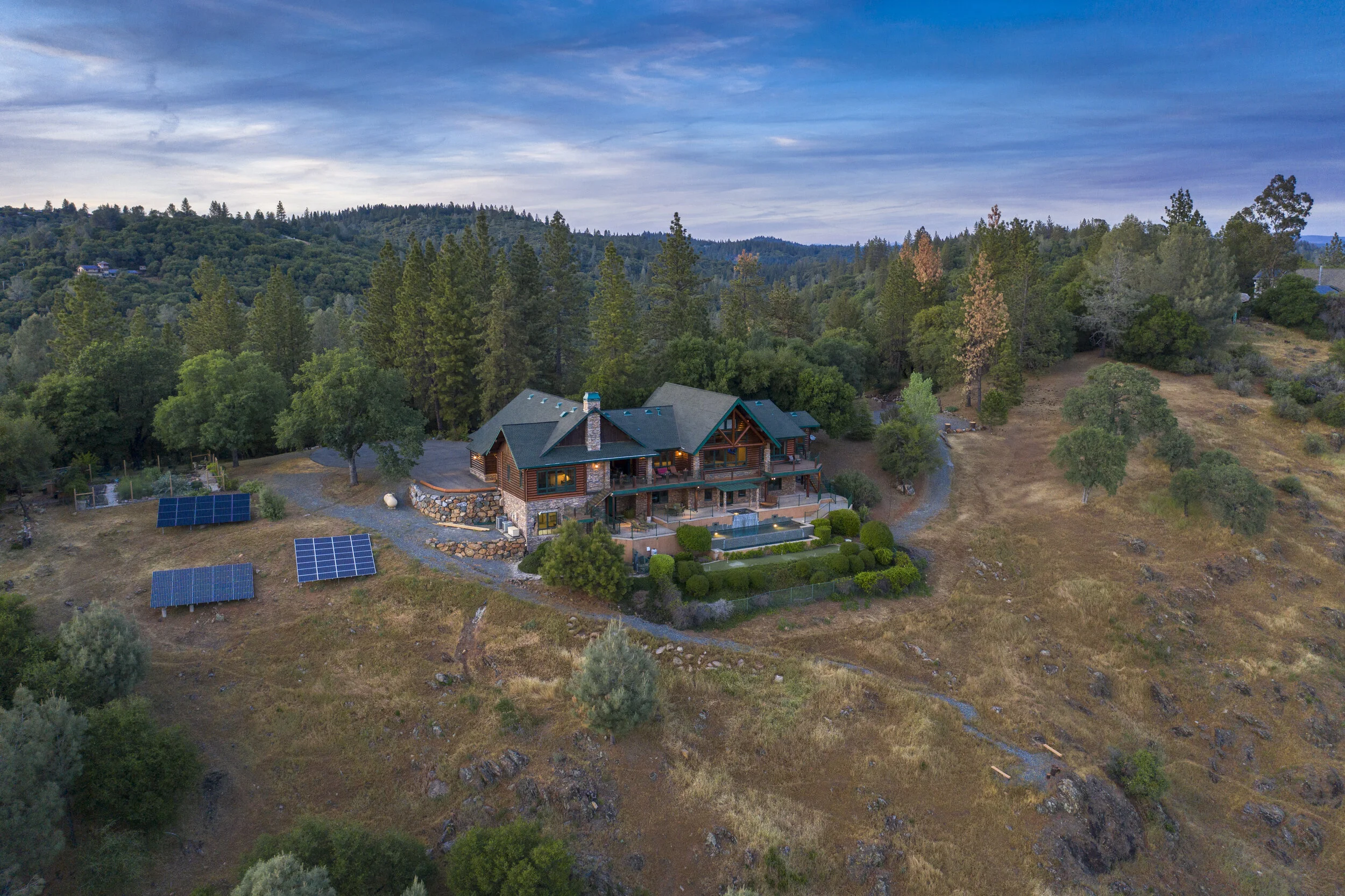 Views for miles! This prestigious property is on 30 Acres bordering federal land with breathtaking views of the American River and Lake Clementine. The log cabin style creates a mountain feeling but sits below the snow-line and is just 40 minutes to Lake Tahoe ski resorts and the Sacramento International Airport and just 10 minutes to year round golfing at Winchester Country Club. Fiber Optic cable for highspeed internet is in ground to the 4,538 square foot house. Owned 163/4kW solar, an emergency generator, a private well, a garden and a chicken coop make this property sustainable along with 25 fire cleared acres. Stately guest quarters are attached by an enclosed patio with an outdoor kitchen and fireplace. Both the guest quarters and master suite are on the main floor with an open concept living area.The views are amazing from every room, the decks, the putting green, the spa and the pool. The spa waterfalls into the heated infinity edge swimming pool with views showcasing Robbers Roost, a granite rock outcropping on the border of the property. Hike to it on your private hiking path. A picturesque seasonal creek greets you at the front of the property near the gated entrance and bridge. The creek has a naturally occurring swimming hole for additional summertime adventures. Keep kids and grandkids entertained with a private playground, safety fencing and great local schools, including Waldorf and public programs.