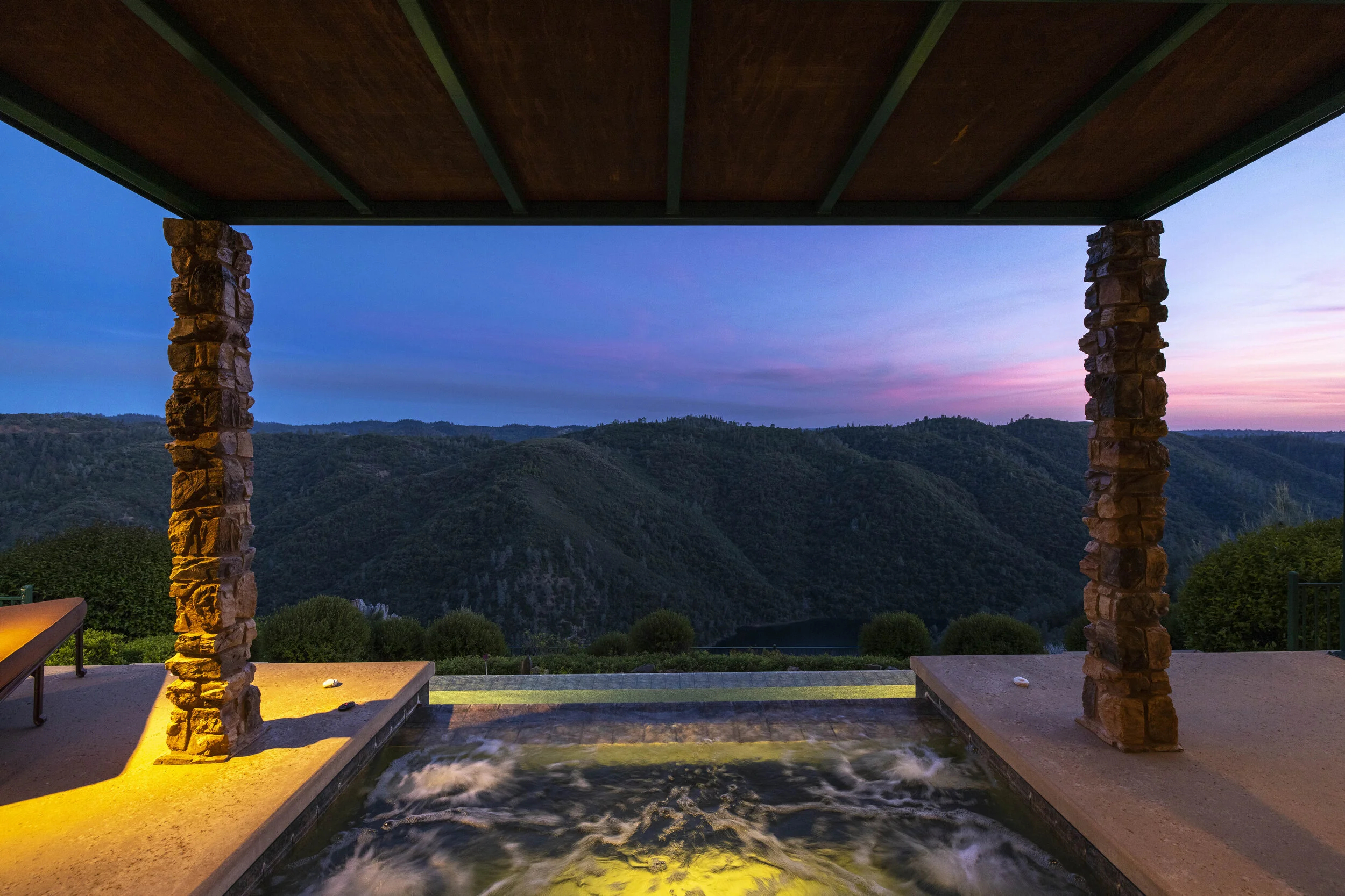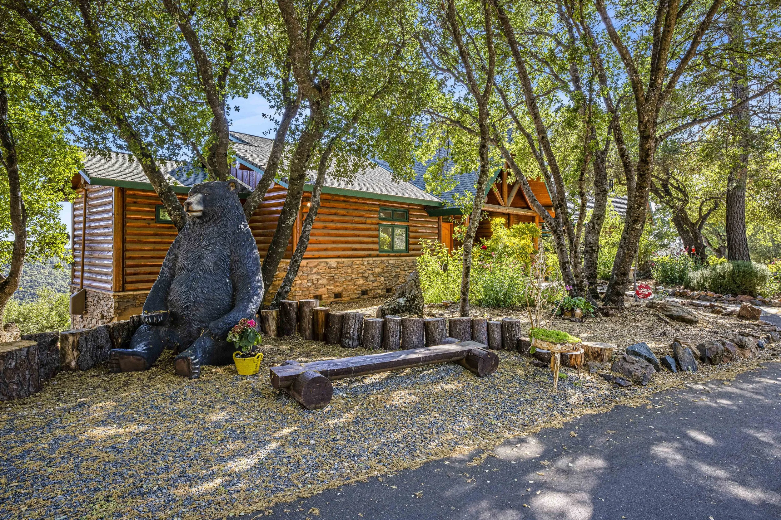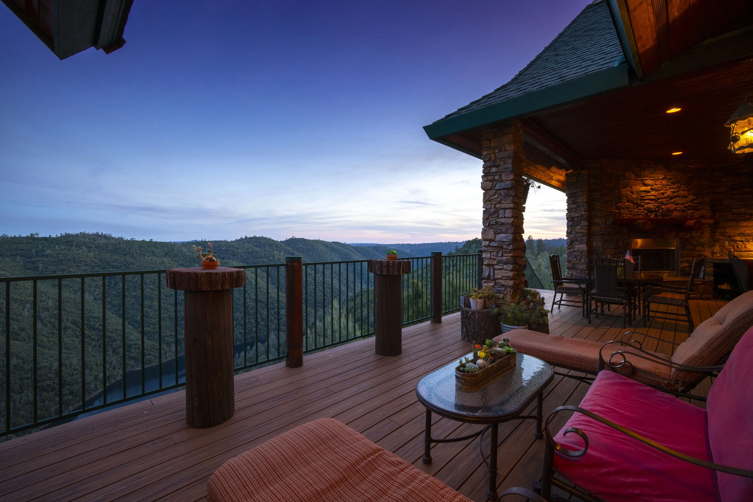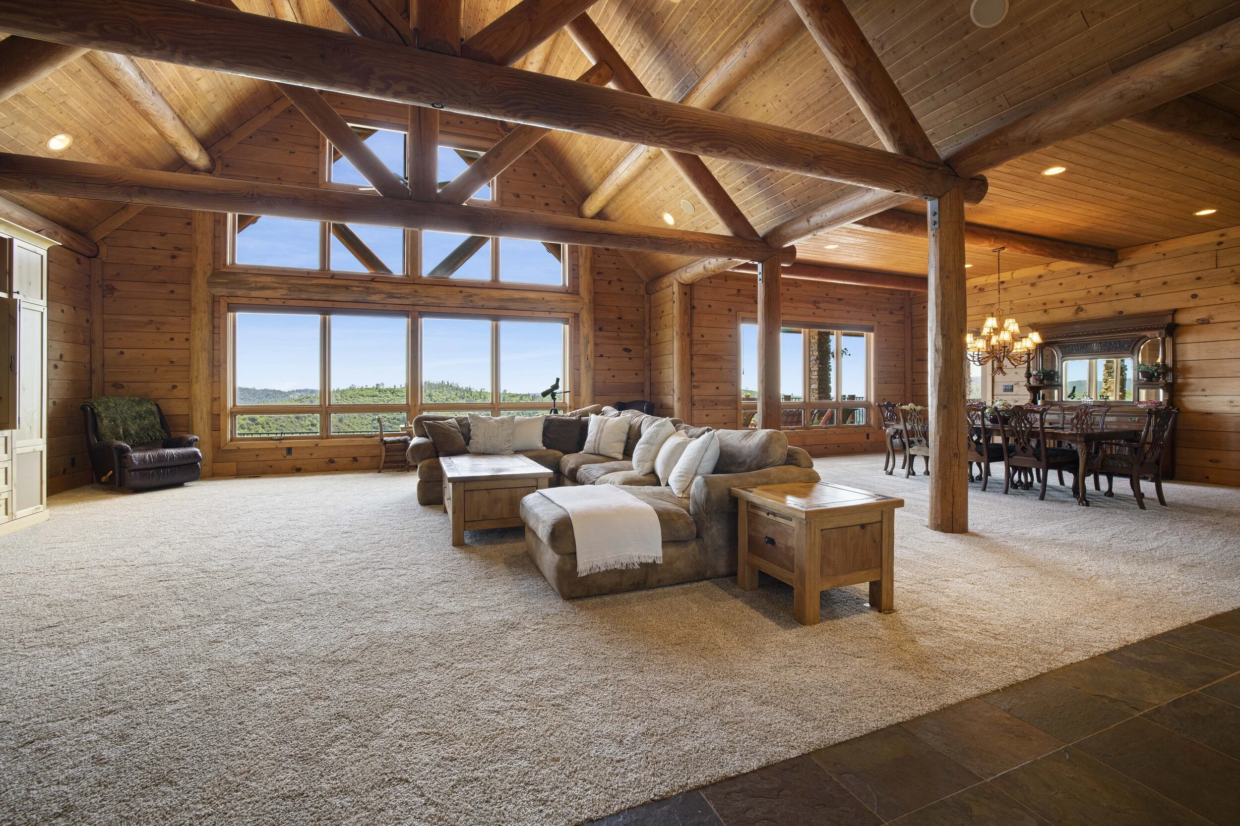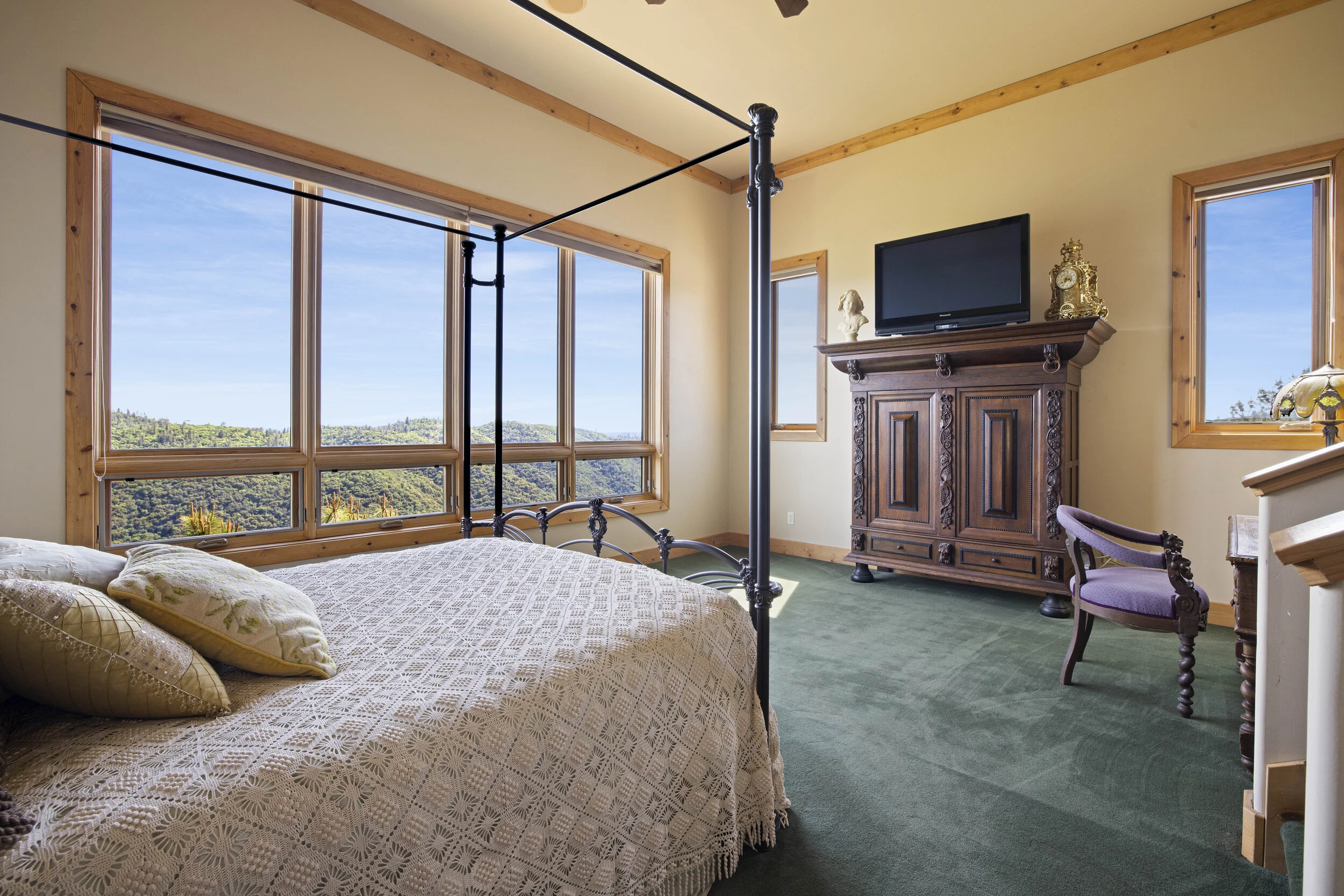 Views for miles! This prestigious property is on 30 Acres bordering federal land with breathtaking views of the American River and Lake Clementine. The log cabin style creates a mountain feeling but sits below the snow-line and is just 40 minutes to Lake Tahoe ski resorts and the Sacramento International Airport and just 10 minutes to year round golfing at Winchester Country Club. Fiber Optic cable for highspeed internet is in ground to the 4,538 square foot house. Owned 163/4kW solar, an emergency generator, a private well, a garden and a chicken coop make this property sustainable along with 25 fire cleared acres. Stately guest quarters are attached by an enclosed patio with an outdoor kitchen and fireplace. Both the guest quarters and master suite are on the main floor with an open concept living area.The views are amazing from every room, the decks, the putting green, the spa and the pool. The spa waterfalls into the heated infinity edge swimming pool with views showcasing Robbers Roost, a granite rock outcropping on the border of the property. Hike to it on your private hiking path. A picturesque seasonal creek greets you at the front of the property near the gated entrance and bridge. The creek has a naturally occurring swimming hole for additional summertime adventures. Keep kids and grandkids entertained with a private playground, safety fencing and great local schools, including Waldorf and public programs.