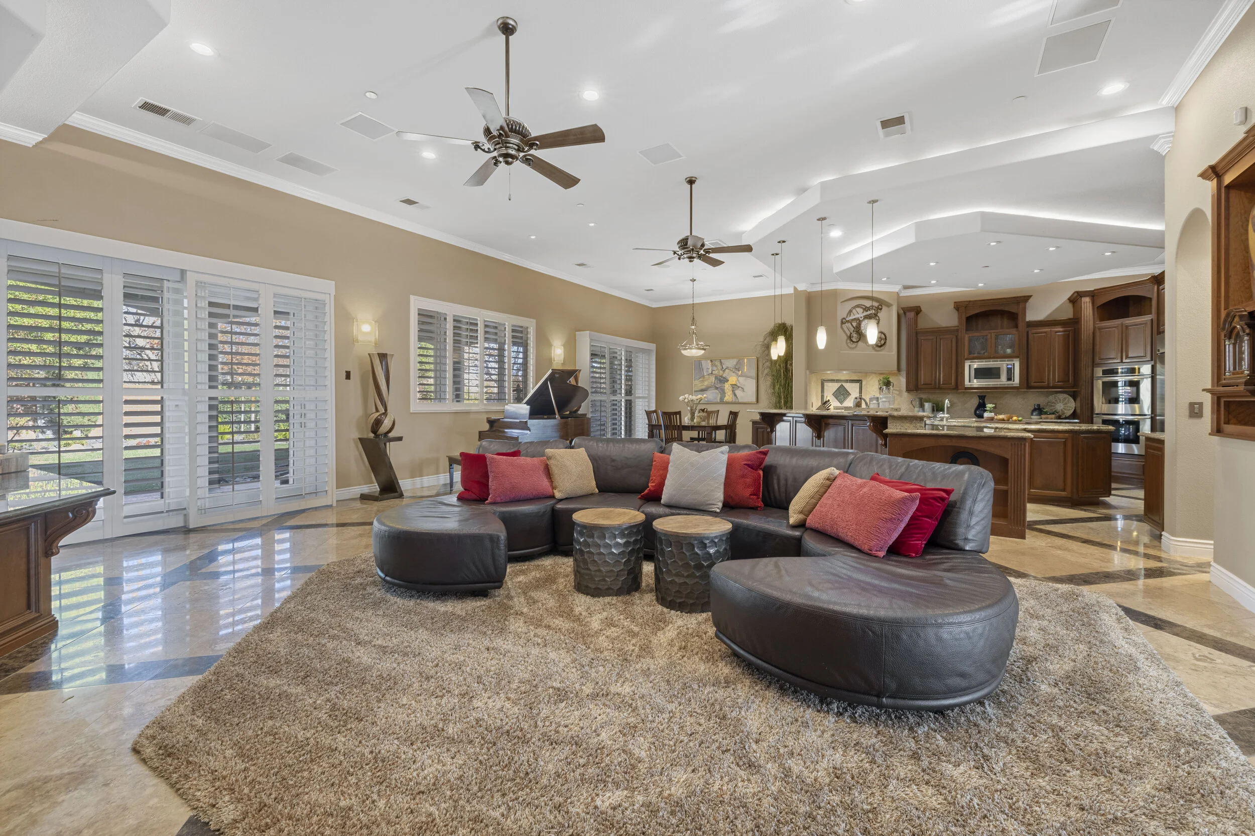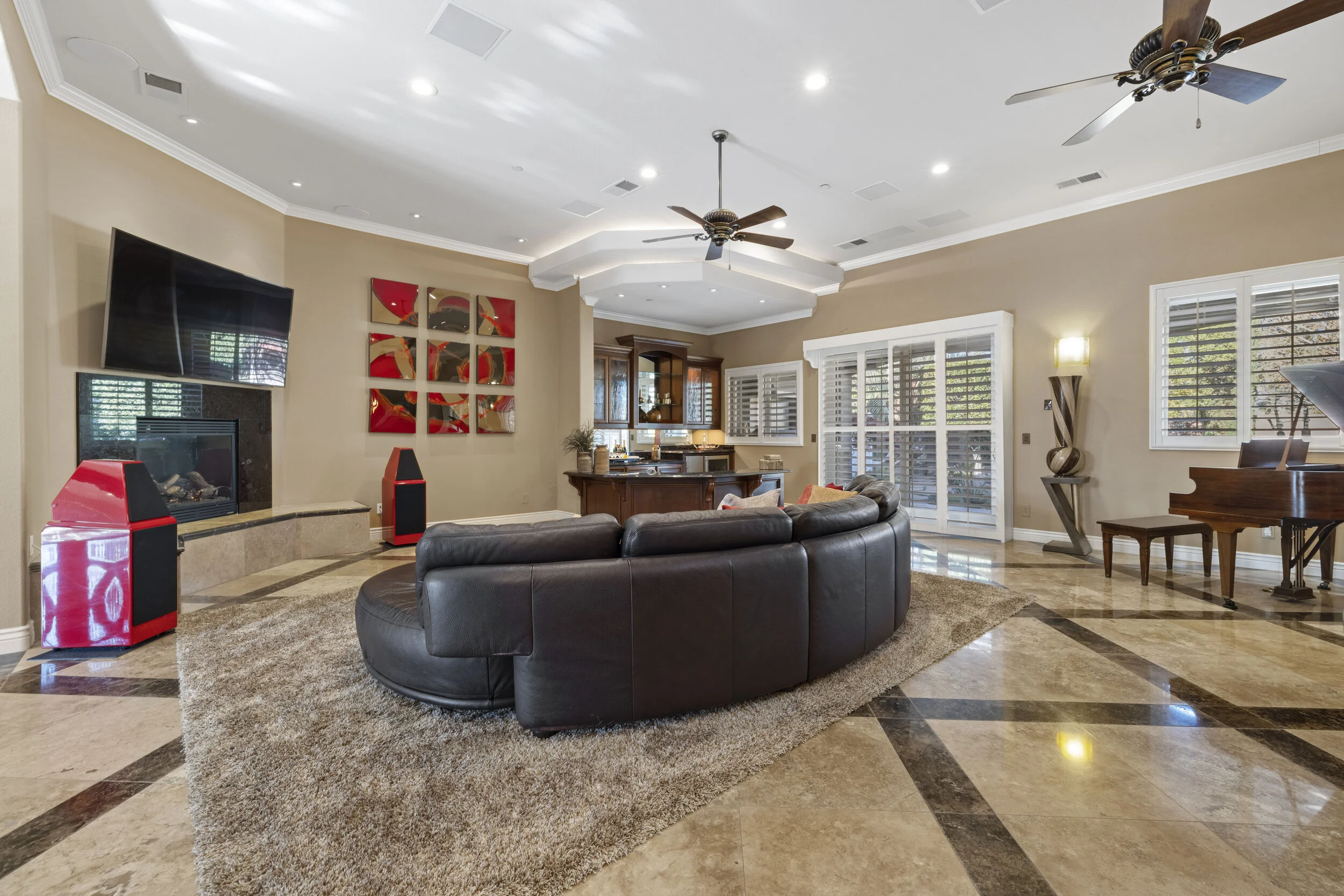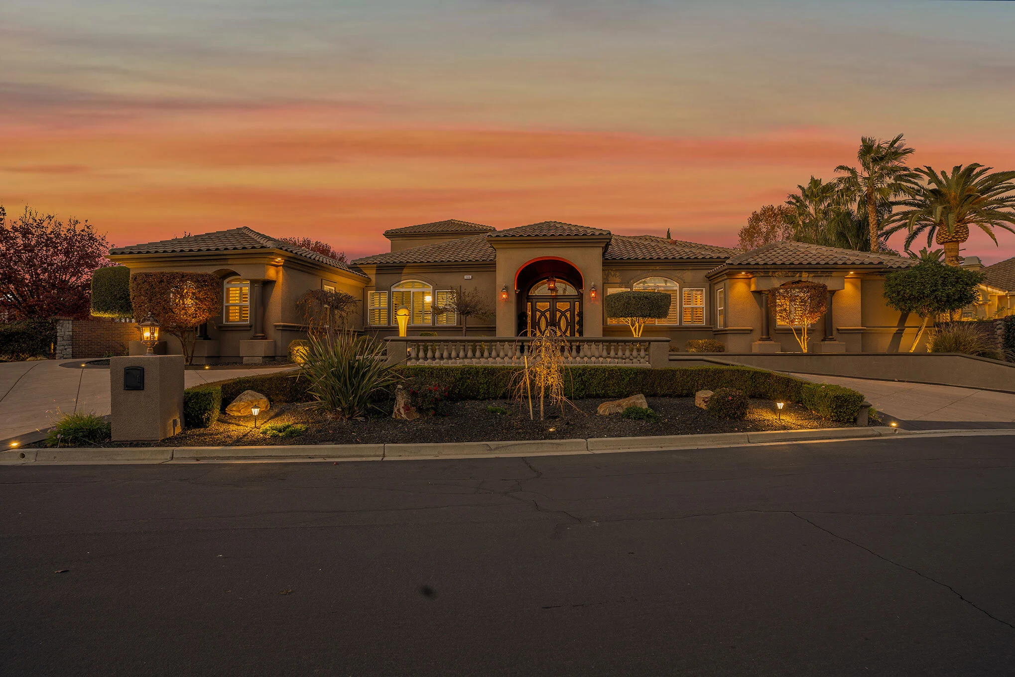 This stupendous custom designed home located in a gated community, will satisfy the most discriminating buyer. It has just about every conceivable upgrade you can imagine. An open floor plan w/ the great room boasting 14' ceilings, sunken bar, ice maker & wine fridge, three En Suite bedrooms, three fireplaces, formal dinning room, office, guest quarters (plumbed for kitchen) an a media room. The massive gourmet Kitchen is an entertainers dream come true, 8 burner Wolf Stove w/Pot filler, center island w/ prep-sink, 2 dishwashers, warming drawer, industrial fridge & freezer, 2 Thermador ovens. No Need to go to the spa, everyday is spa day w/ an exotic and exquisitely designed Gunite, salt water soaking tub, ceiling water fall, walk in slate shower w/10 shower heads, & 2 walk in closets. Enjoy the covered barbecue area with all amenities of an indoor kitchen & the 12 person hot tub feeling as if you are in your Private Oasis. This is a SMART HOME & one truly unique property.
