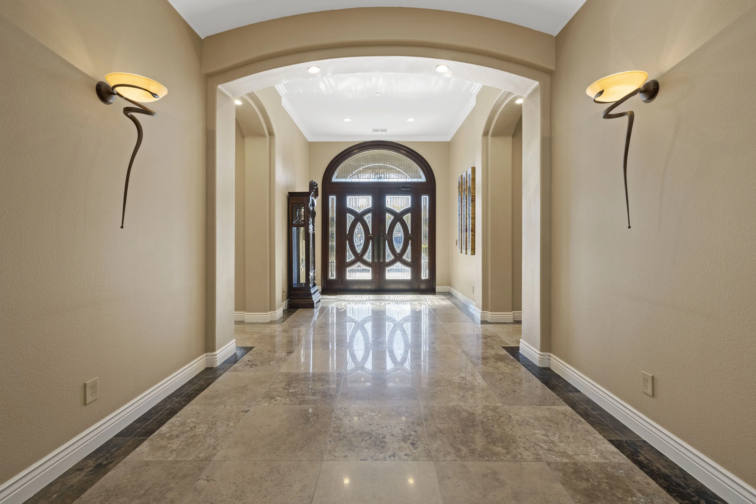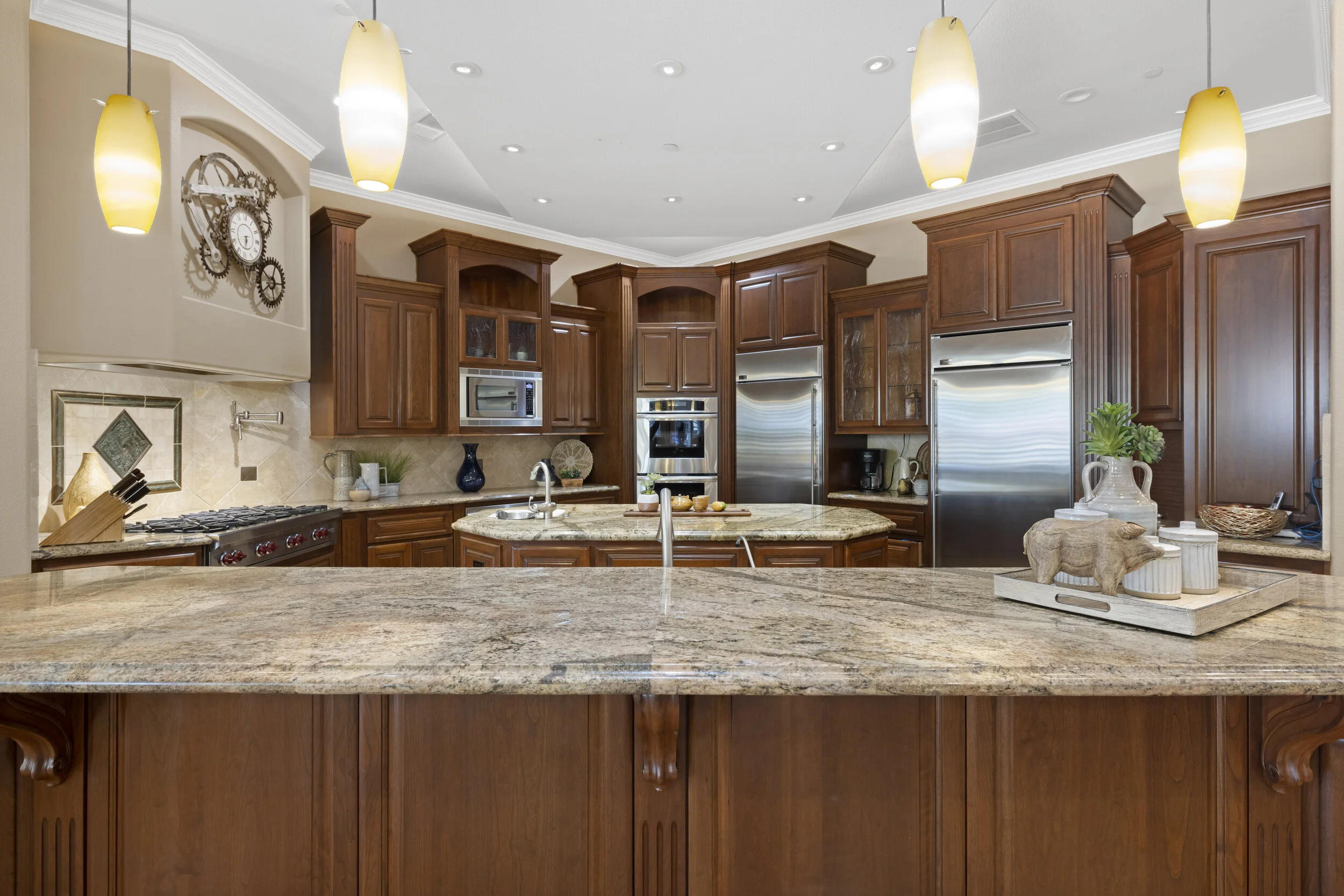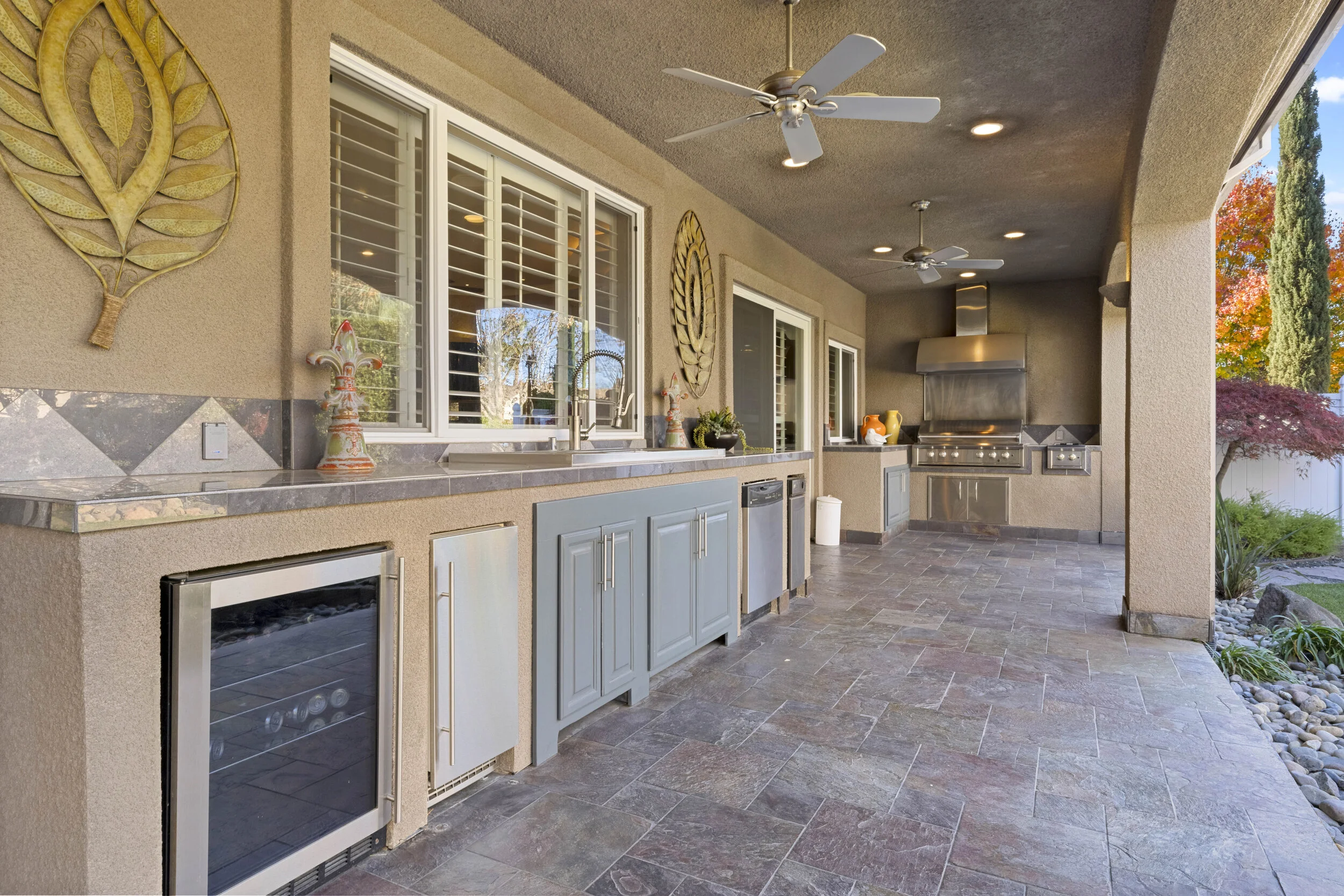 This stupendous custom designed home located in a gated community, will satisfy the most discriminating buyer. It has just about every conceivable upgrade you can imagine. An open floor plan w/ the great room boasting 14' ceilings, sunken bar, ice maker & wine fridge, three En Suite bedrooms, three fireplaces, formal dinning room, office, guest quarters (plumbed for kitchen) an a media room. The massive gourmet Kitchen is an entertainers dream come true, 8 burner Wolf Stove w/Pot filler, center island w/ prep-sink, 2 dishwashers, warming drawer, industrial fridge & freezer, 2 Thermador ovens. No Need to go to the spa, everyday is spa day w/ an exotic and exquisitely designed Gunite, salt water soaking tub, ceiling water fall, walk in slate shower w/10 shower heads, & 2 walk in closets. Enjoy the covered barbecue area with all amenities of an indoor kitchen & the 12 person hot tub feeling as if you are in your Private Oasis. This is a SMART HOME & one truly unique property.