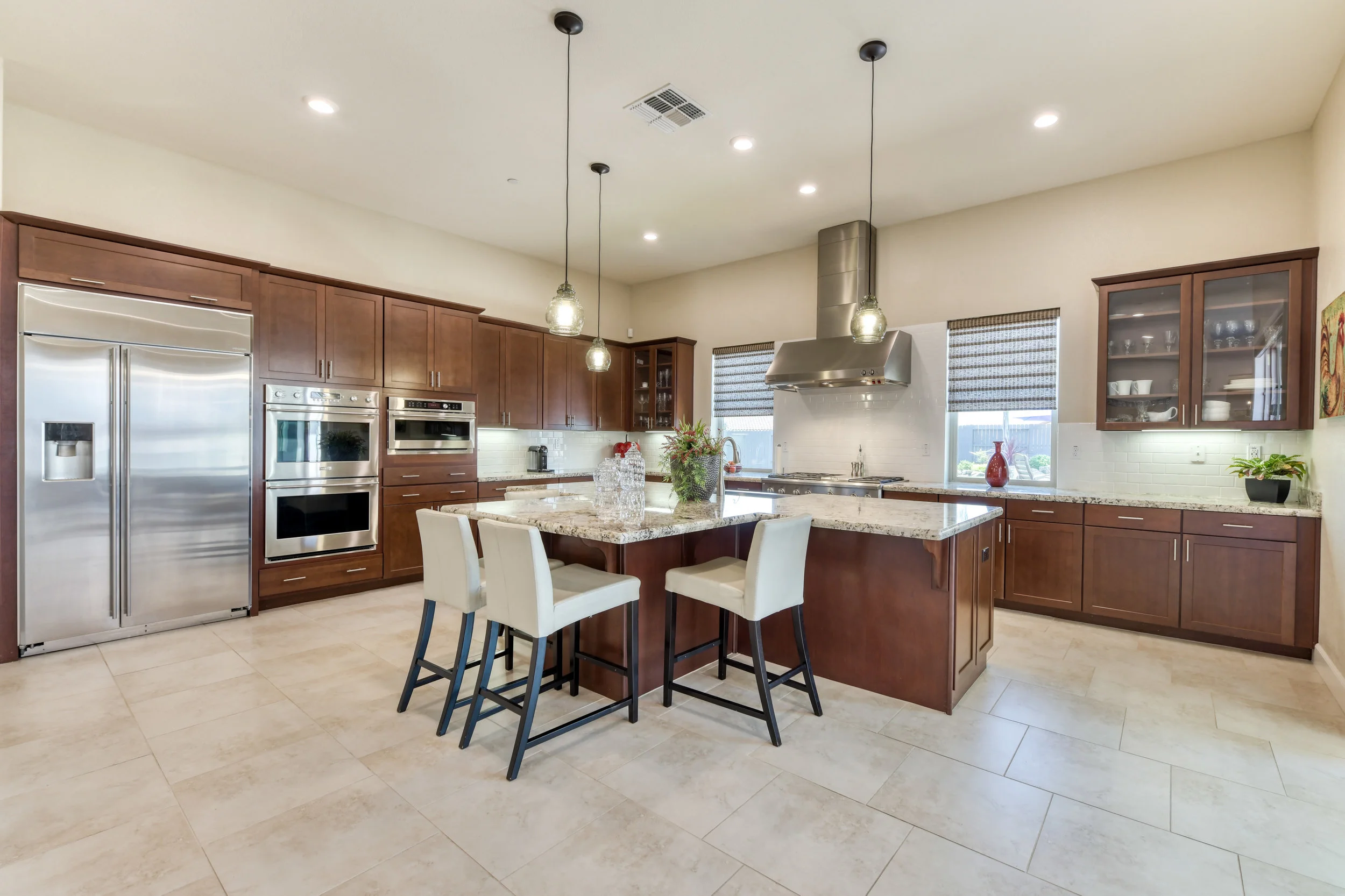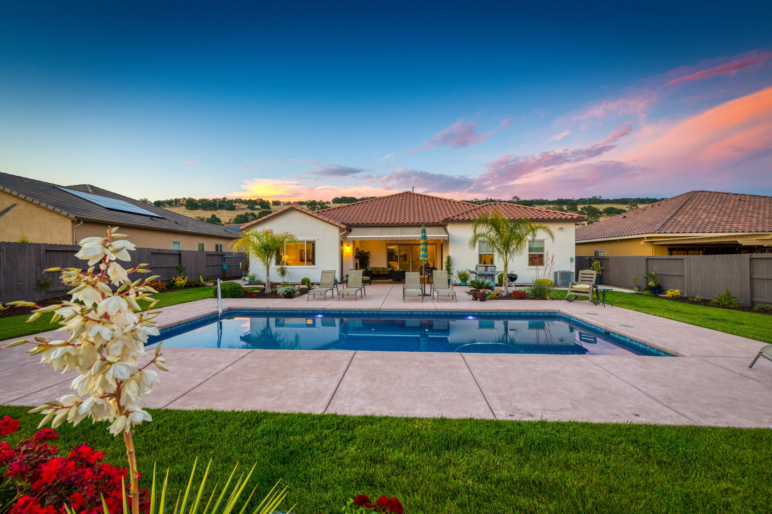 Located in The Ridge at Blackstone, this beautiful home feels more like a private getaway. A single story Lennar (ei- everything included) energy efficient masterpiece, complete with (owned) solar panels. It lends a serene view of palm trees and blue water (pool). The beautifully landscaped backyard features flat and usable space. The open floor plan in the kitchen, living, and dining rooms allow for plenty of circulation areas and ease of mobility. This home is an entertainer's dream, and a private person's solace! While the master suite provides dual walk-in closets and direct access to the California room (patio), it is tucked away and boasts a serene view of the private backyard. The master bath features a walk-in shower, stand alone tub, and a fabulous vanity. Three additional bedrooms offer the option for dens and private offices. This residence is a refreshing site and sight!