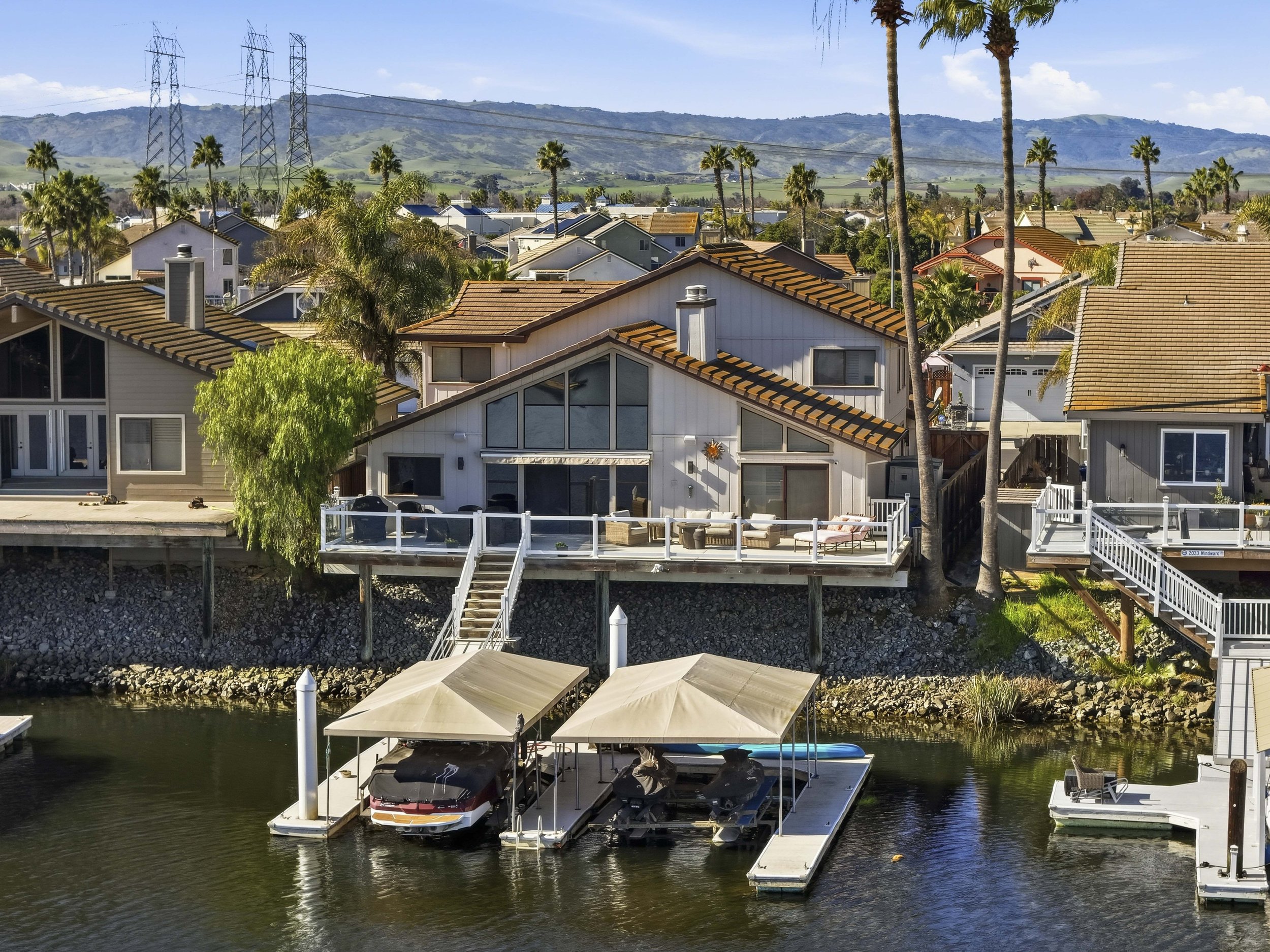 Beautifully remodeled waterfront home with breathtaking views and sought after eastern exposure, oversized double U-shaped dock and a 3 car garage. Spacious open floor plan with soaring ceilings and lots of natural light. Chef’s kitchen features granite slab counters, stainless steel appliances (including double oven), large island and breakfast bar. Spacious downstairs primary suite features gorgeous water views with soaring ceilings, sliding glass door to deck, fireplace, two huge walk-in closets and a spa-like bathroom. Upstairs features 3 additional spacious bedrooms. Don’t miss the bonus bathroom space upstairs, making this home truly unique. Gorgeous new flooring. New interior doors. New custom stair railing, and so much more. Tons of storage space. Perfect for entertaining! Access to over a thousand miles of delta waterways from your backyard!