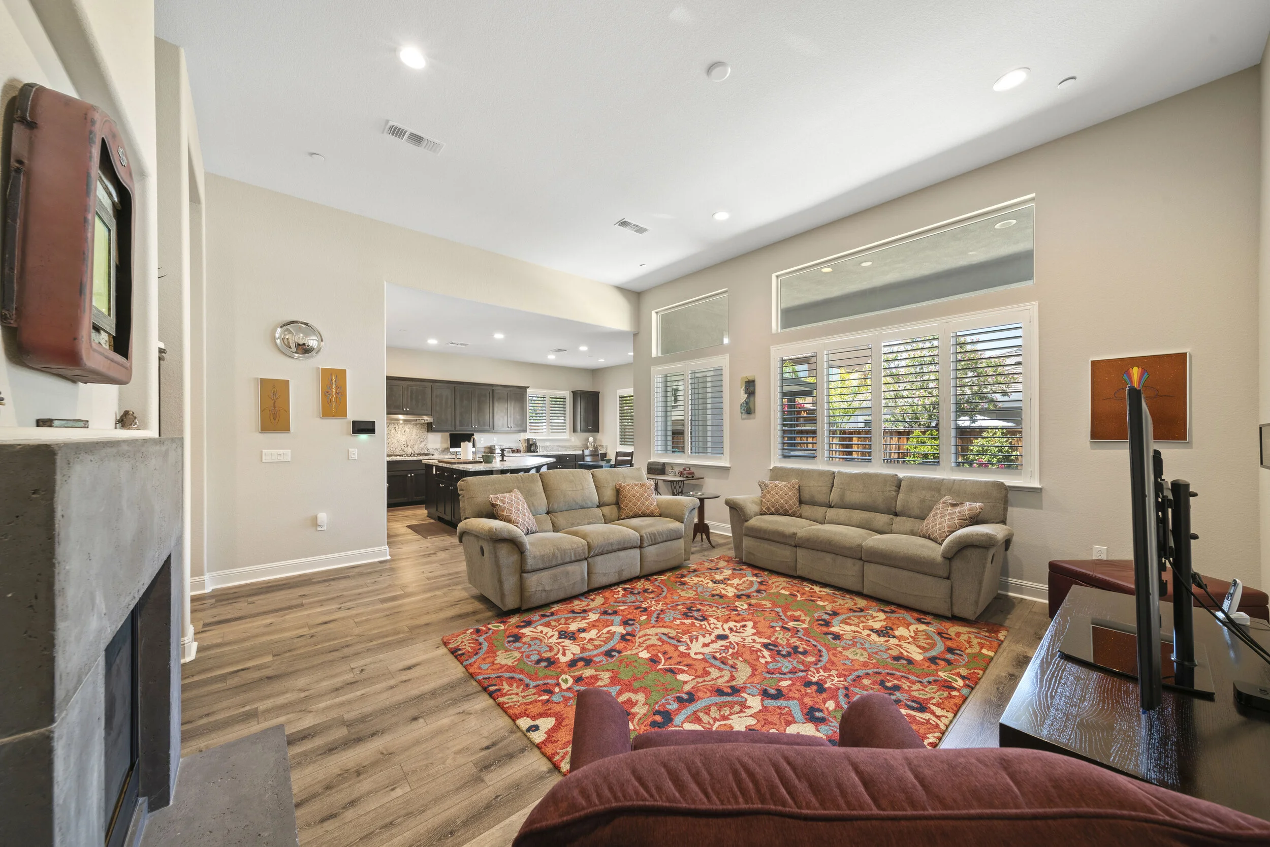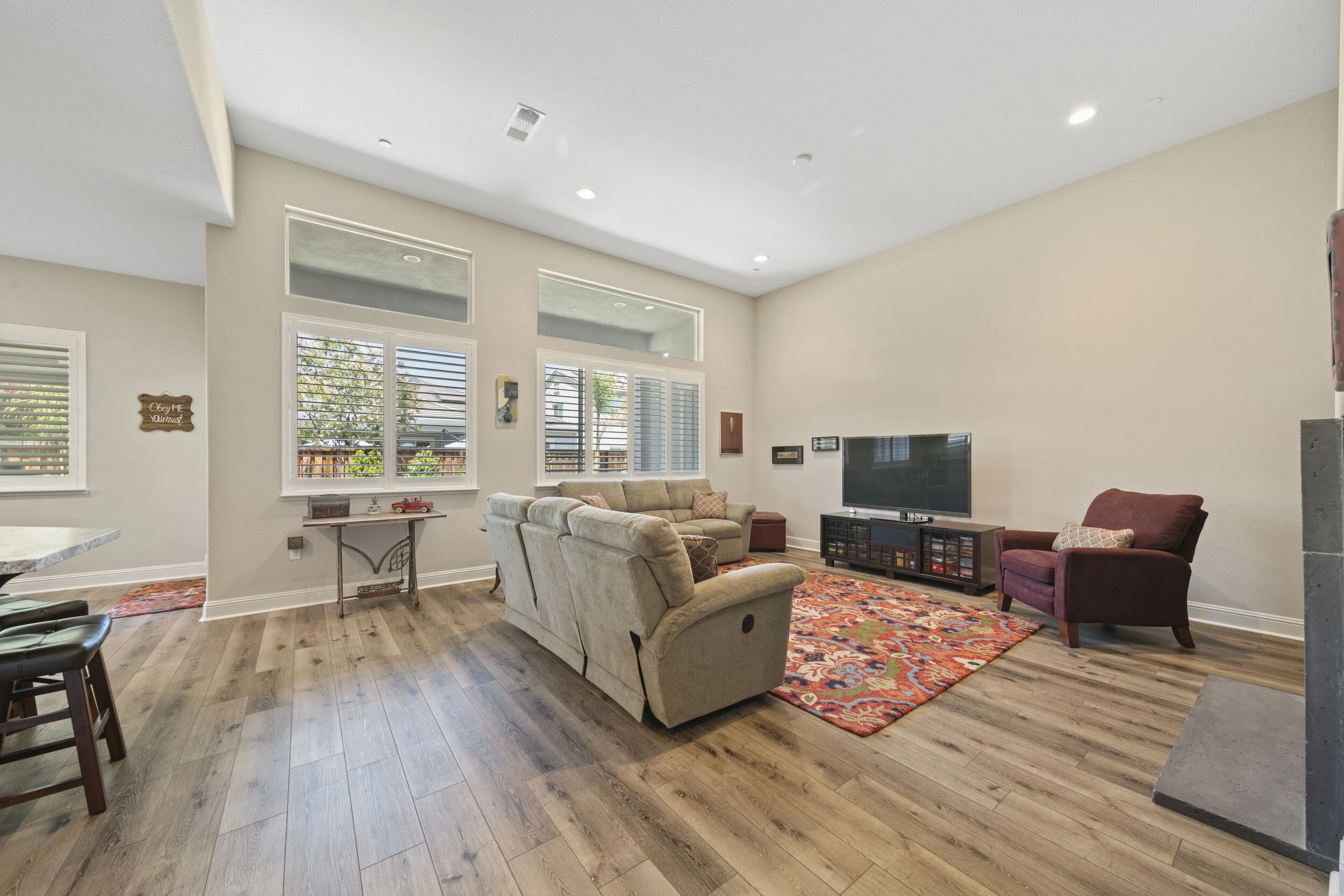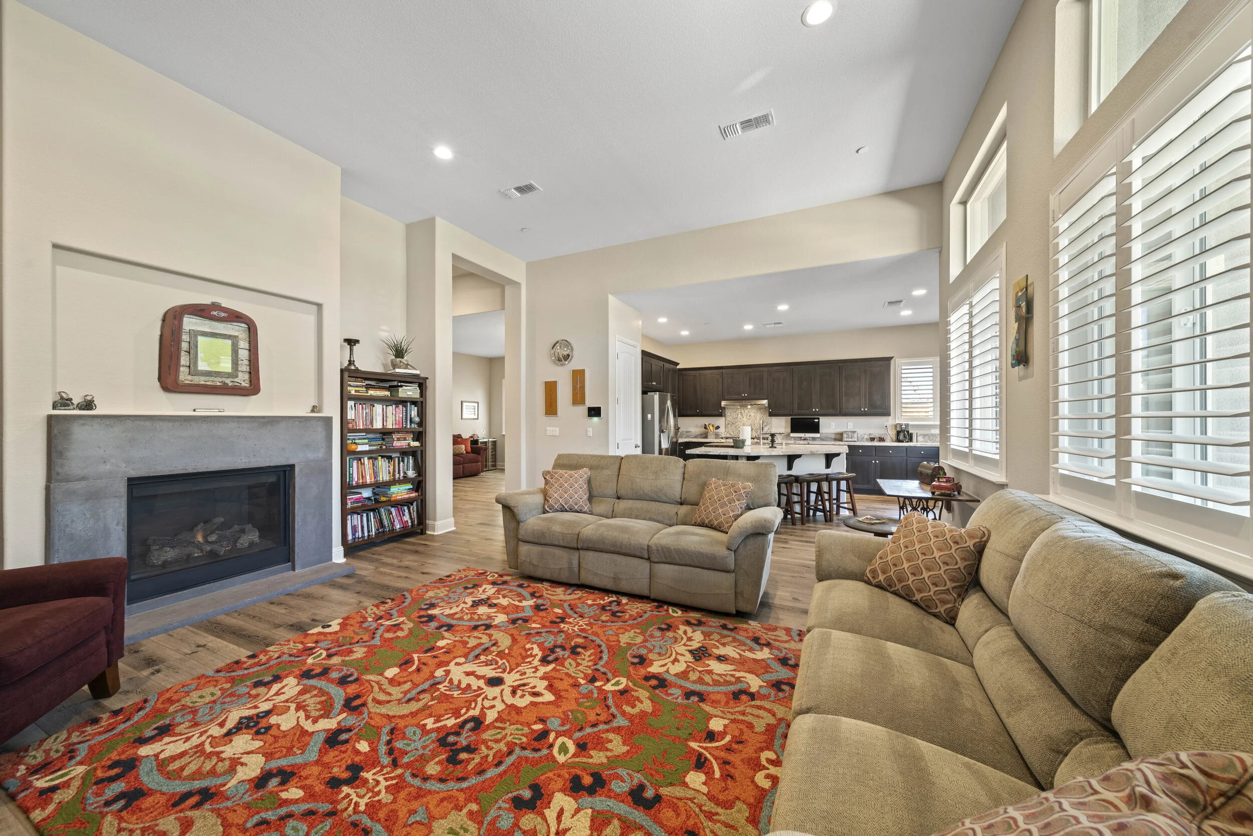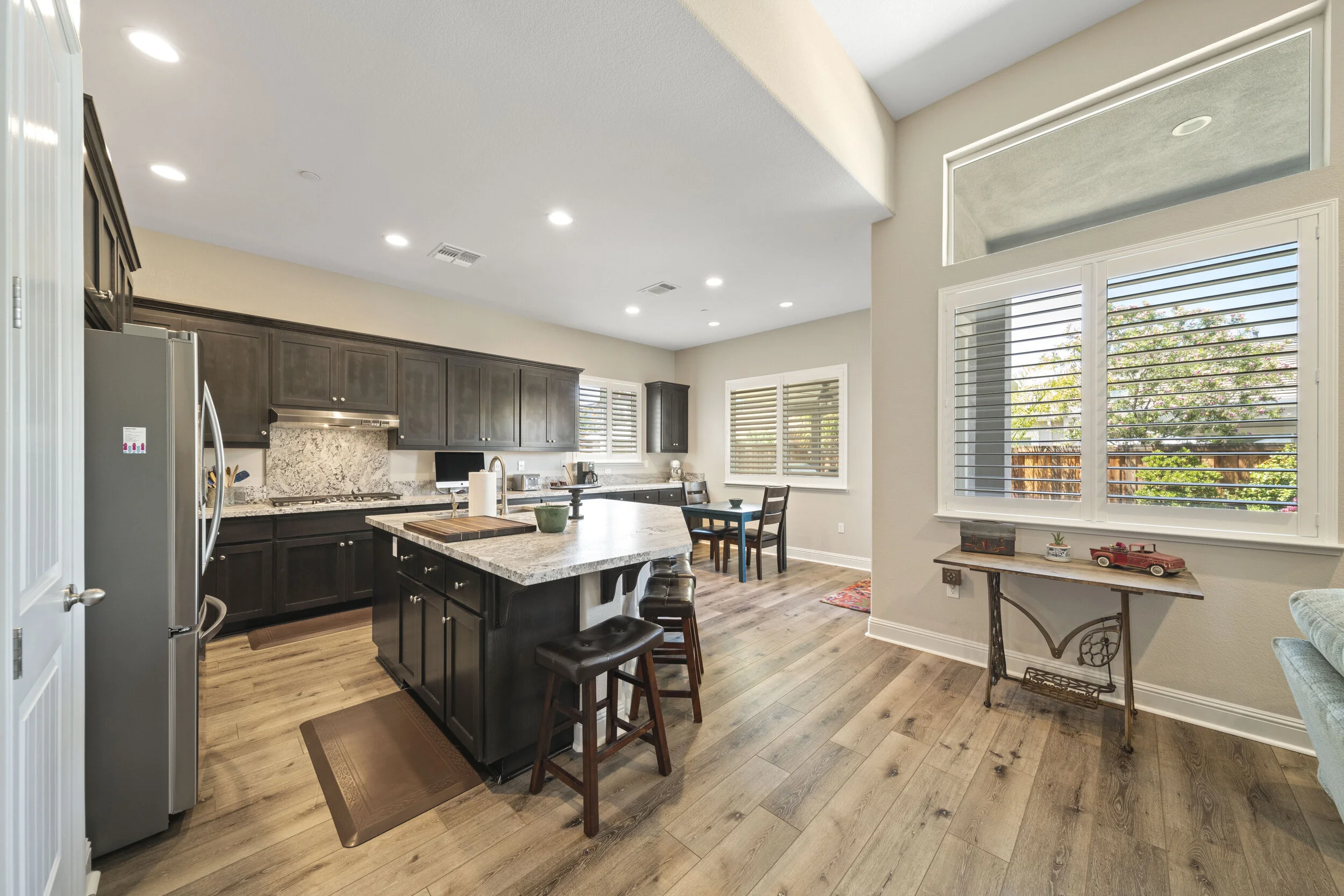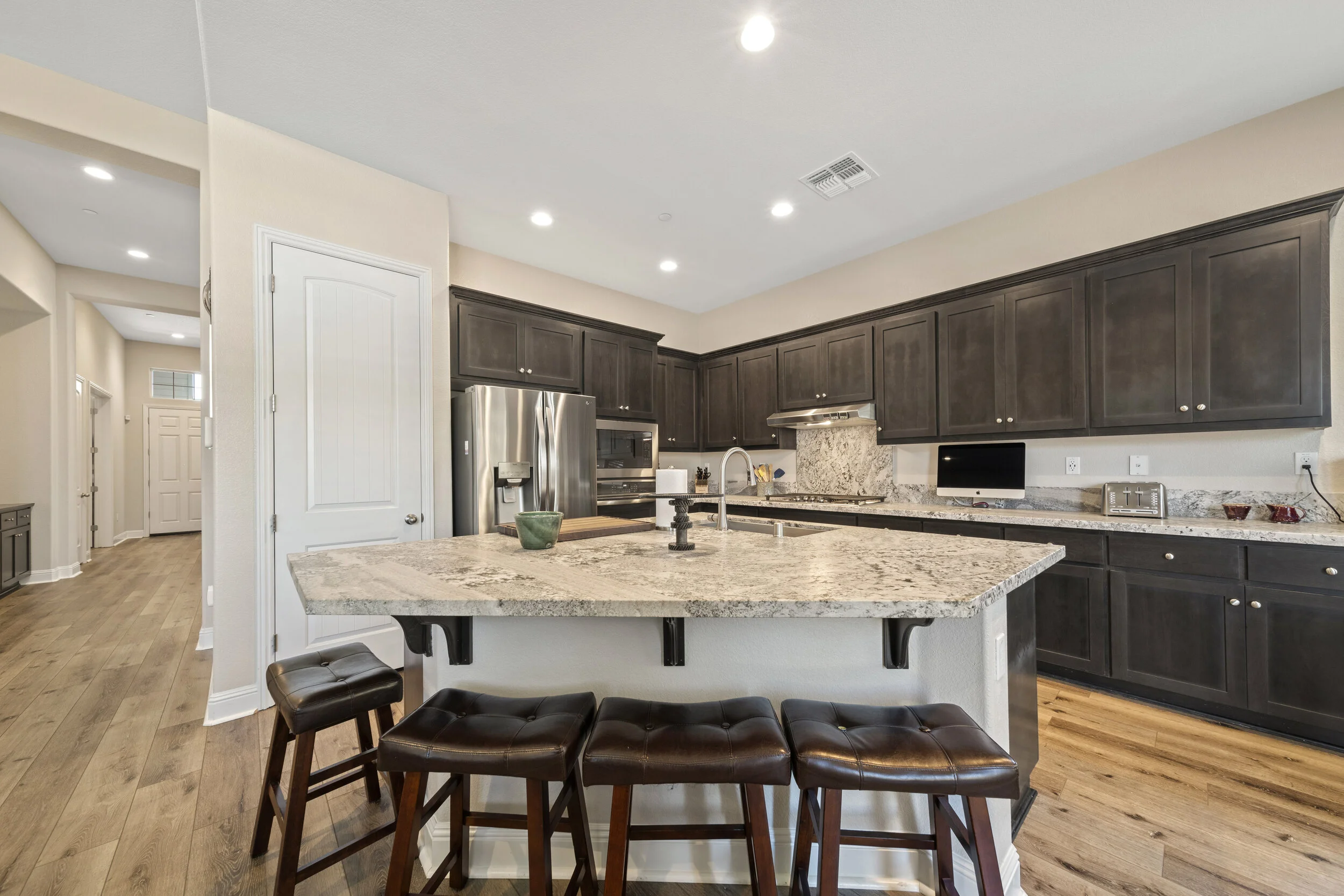 Sought-after single-story home in the prestigious Villagio Community! This beautiful home features a separate Living room & Dining room, high ceilings, extensive vinyl flooring, and shutters. The gourmet kitchen includes Granite counters, stainless steel appliances, center island with sit-at-bar, pantry and plenty of cabinet storage. The main bathroom includes quartz counters, large tub with shower stall and a large walk-in closet with organizer. This backyard boasts a covered patio with ceiling fan, a built in BBQ with abundant storage and counter space, a gas firepit, and stone patio, perfect for entertaining. Additional features include multiple ceiling fans, built in garage cabinets with workspace, tankless water heater, laundry utility sink, water filter system, reverse osmosis, and more. Conveniently located close to an elementary school. The Brentwood Family Aquatic Complex, elementary school, Brentwood Senior Activity Center, and multiple parks.
