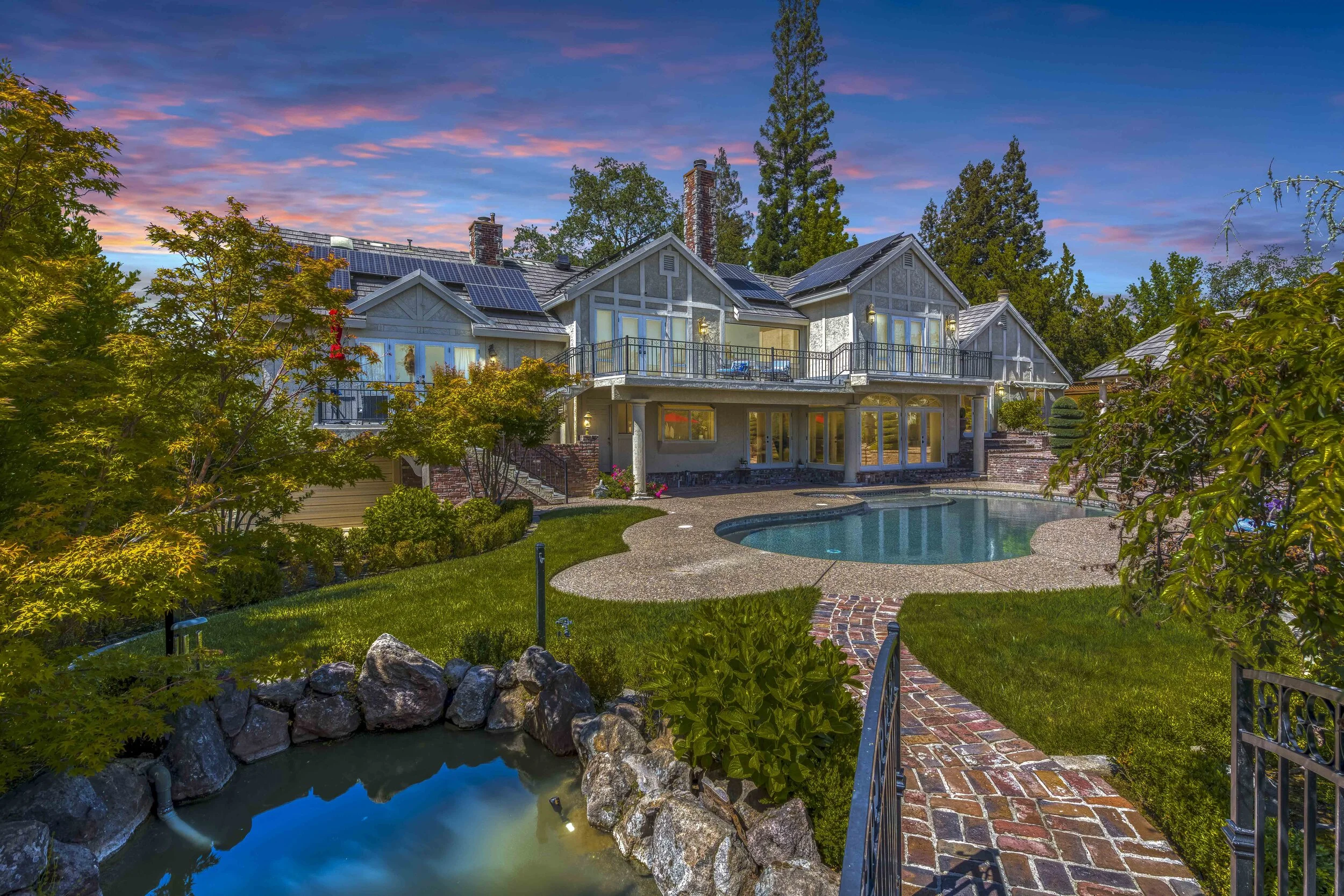 This modern Tudor-style home sits on the bank of the American River and is hemmed in with lush landscaping making it the perfect private escape. Inside the home boasts two master bedrooms, each with a fireplace and one with it's own balcony overlooking the yard. Recreation abounds here! Swim in the picturesque pool, enjoy a drink at the home bar, play a round of pool, cook in the outdoor kitchen, walk to the river, and so much more! This resort-like home is in a class of its own.
