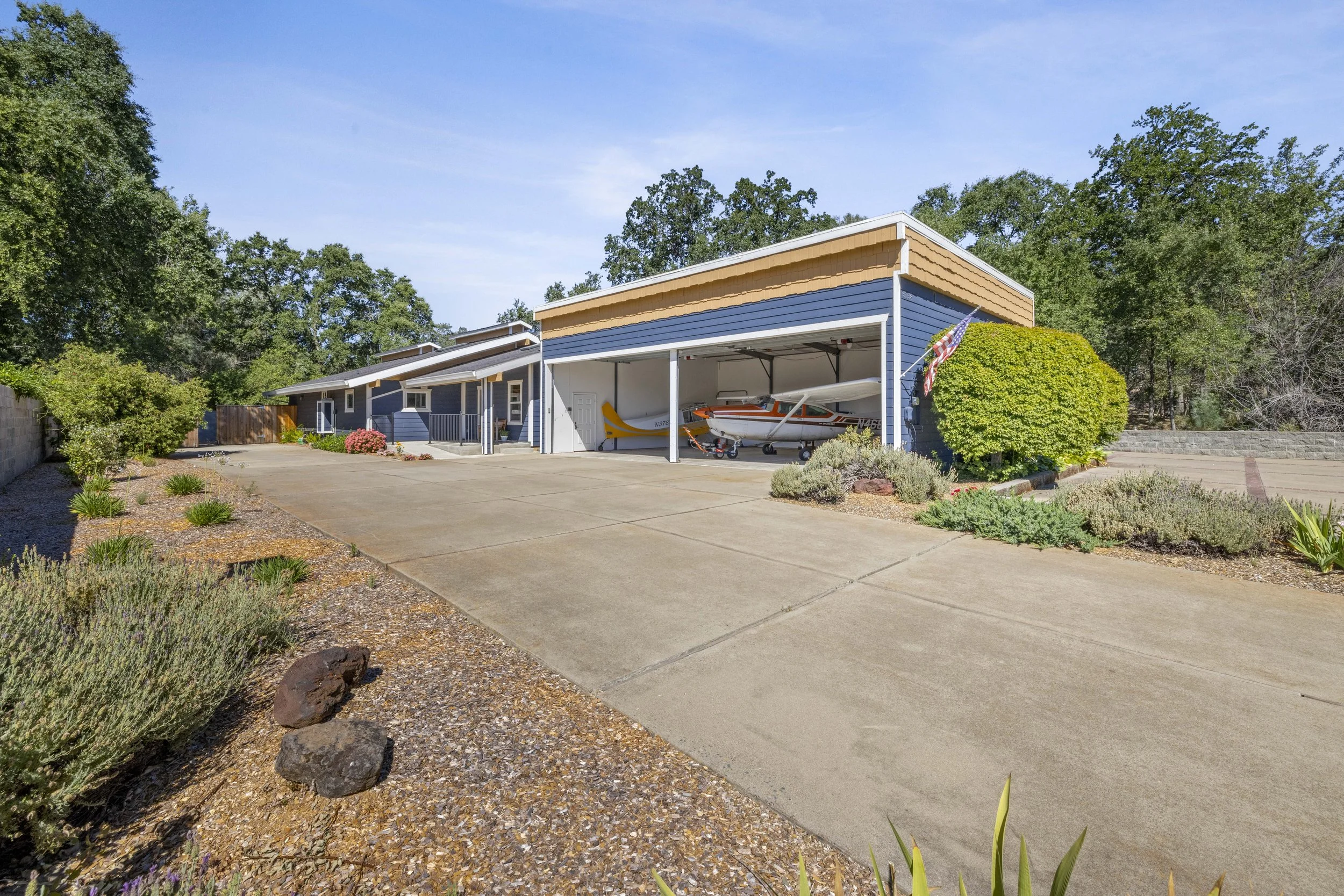 Resting at the end of a quiet cul de sac in the hills of Cameron Park, this turnkey home backs to Deer Creek, La Rock Creek and Cameron Park Lake. Have a plane? Perfect -- you can drive your plane down the street to Cameron Park Airport. The home greets you with a plane hangar and an inviting front porch. Indoors, the home features exposed wood beams, vaulted ceiling, an abundance of natural light, and OWNED SOLAR!!. Updated with all new cabinets, new flooring, new countertops, sky lights, garage doors, hangar doors, and paint in the interior and exterior. The spacious kitchen features a breakfast bar with seating, plenty of storage, pantry cabinet, and opens to the dining space and family room with a fireplace and outdoor access. Two of the bedrooms also feature outdoor access. Outdoors, take advantage of the sitting areas and the peace and quiet as the lot is surrounded by nature, wildlife, and walking trails. Located minutes to HWY 50, Cameron Park and Serrano Country Club.