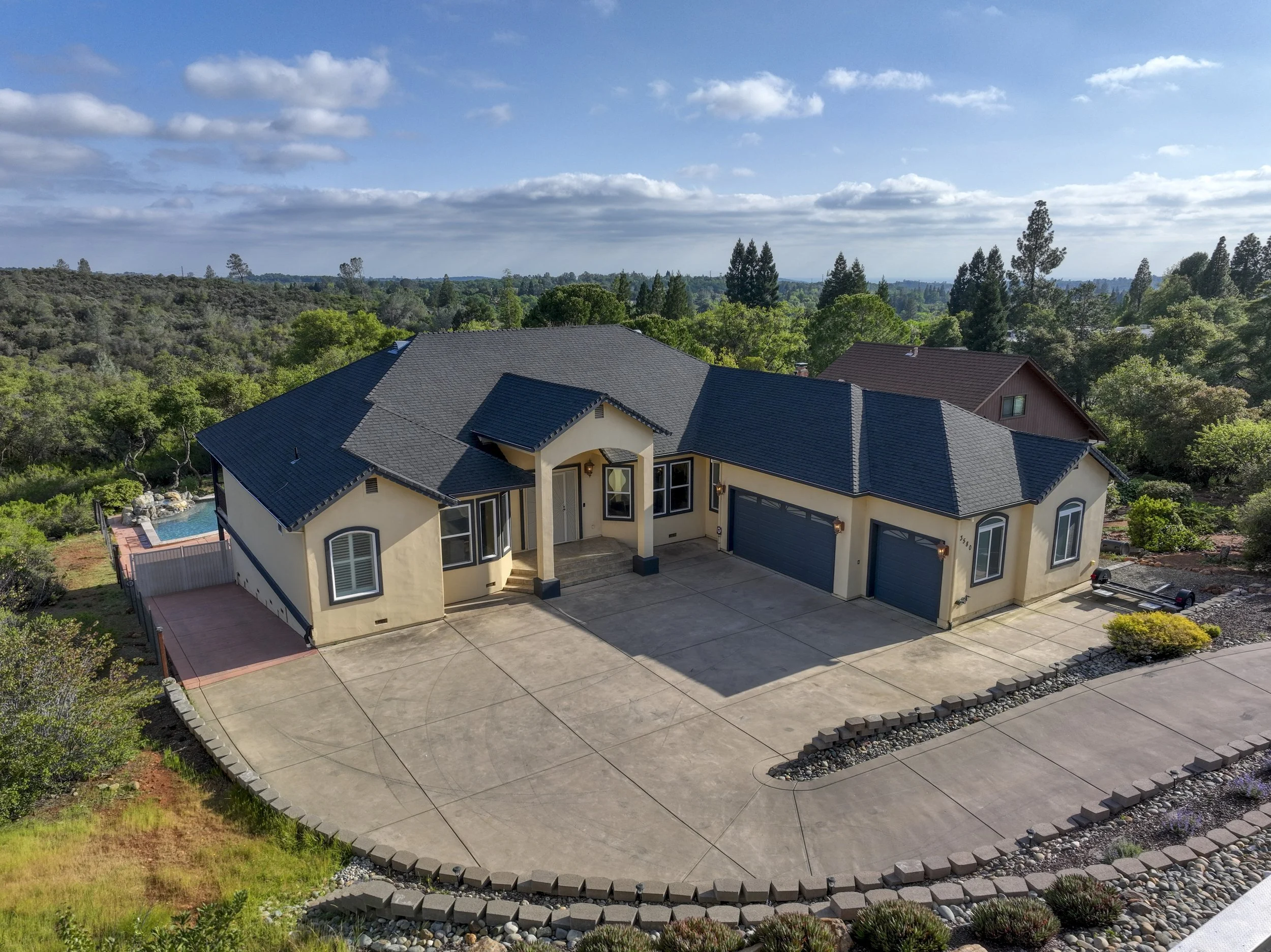 Tucked at the end of a quiet cul-de-sac in desirable Cameron Park, this stunning 3,460 sq ft home offers luxury, privacy, and functionality. From the moment you enter, the views will take your breath away. Designed to live like a single story, it features 3 spacious bedrooms each with its own full bath, plus an additional 4th full bathroom. The open-concept kitchen with island and built-in appliances flows seamlessly into the family room, complete with a cozy wood-burning stove. Access the outdoor patio from the front sitting room or the kitchen making it the perfect spot to enjoy your morning coffee or a glass of wine in the evening. Downstairs, enjoy a spacious game room, temperature-controlled wine cellar, and direct access to the resort-style backyard with pool, outdoor kitchen, and multiple covered patio areas. A spiral staircase connects the large upper deck and balcony to the backyard oasis. Backing to BLM land, this home offers peaceful views and added privacy. Car enthusiasts will love the 3-car garage with a lift, and the whole-house backup generator with automatic transfer switch adds peace of mind. Want the feel of living in the country without the constant yard work? This is a rare blend of comfort, style, and thoughtful designthis is a must-see property!