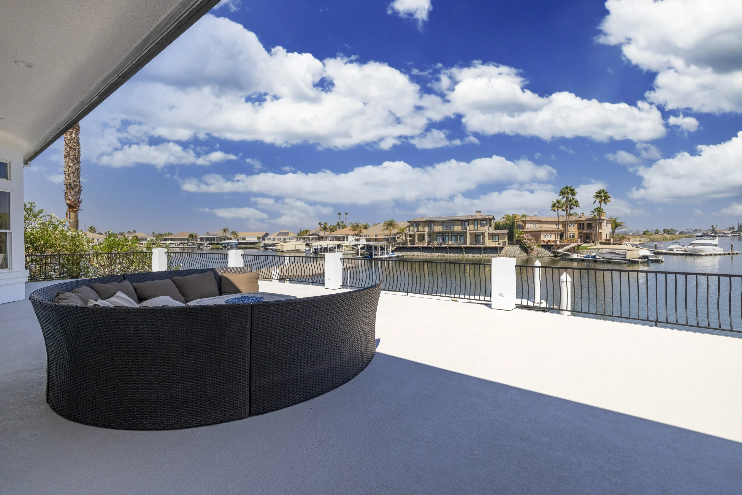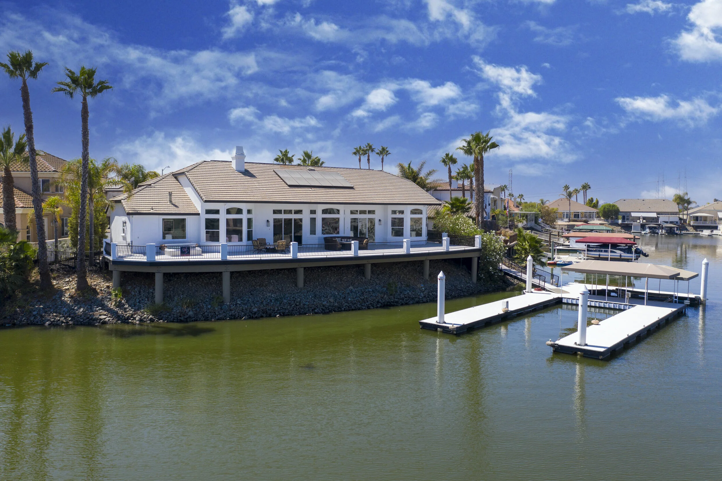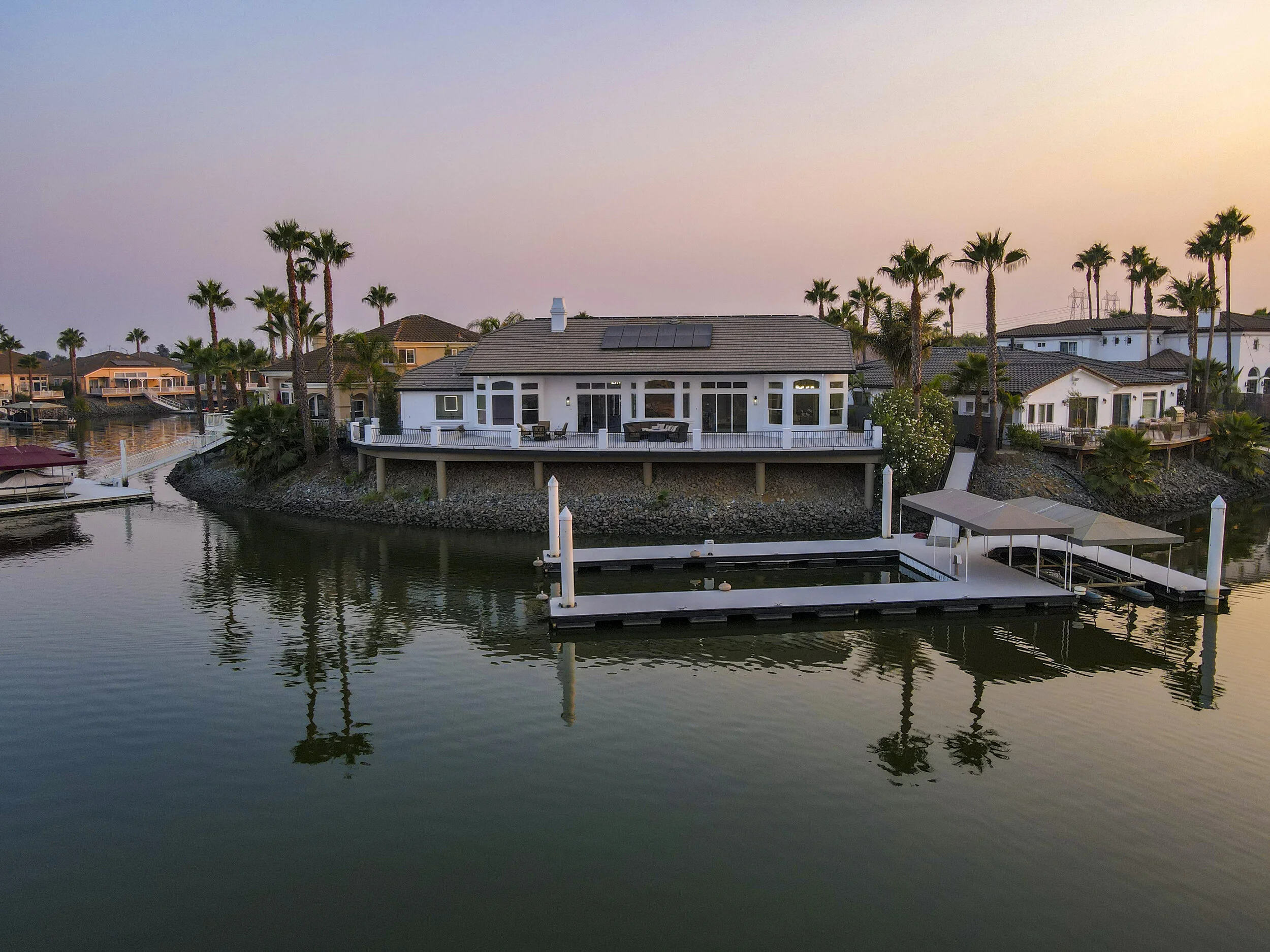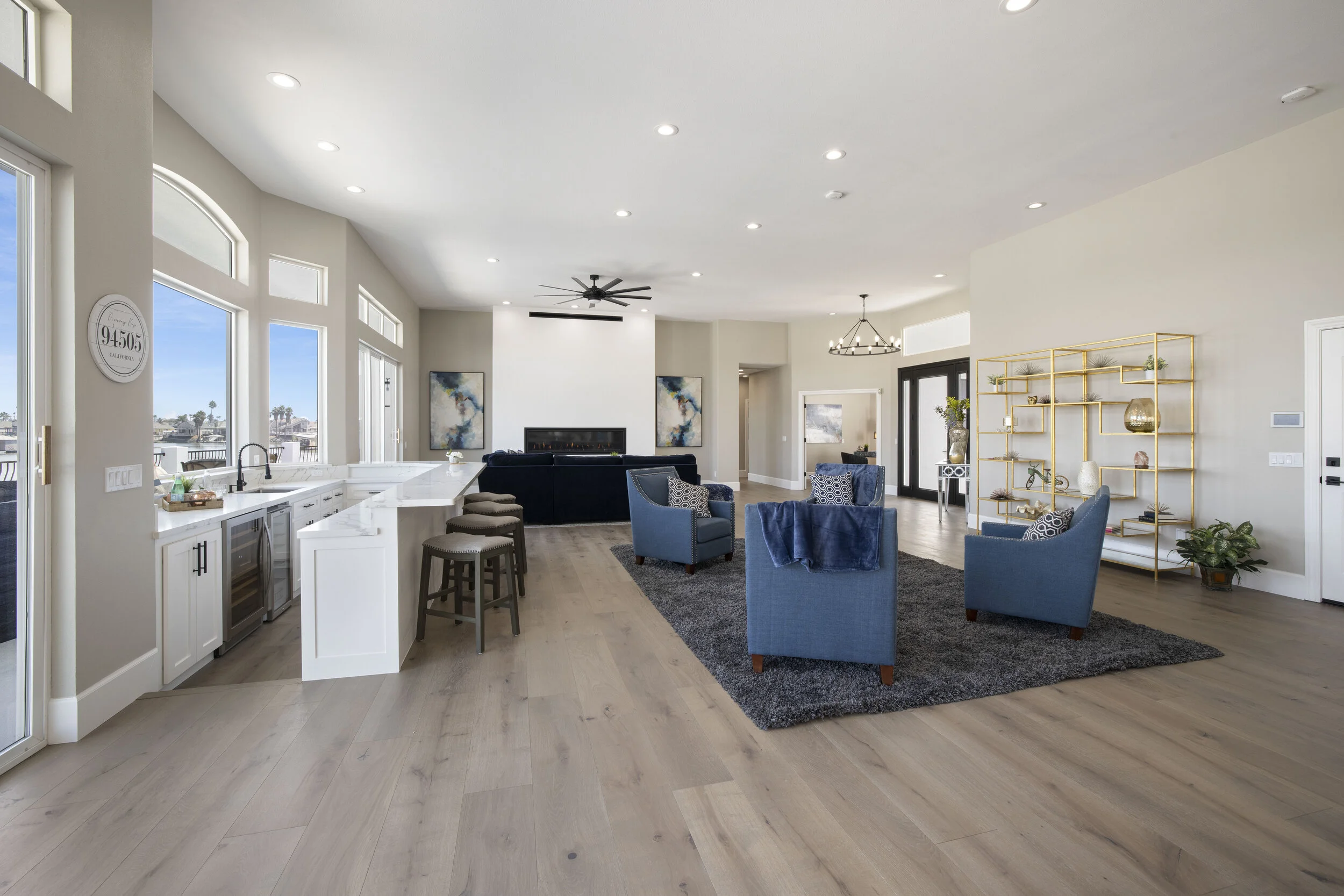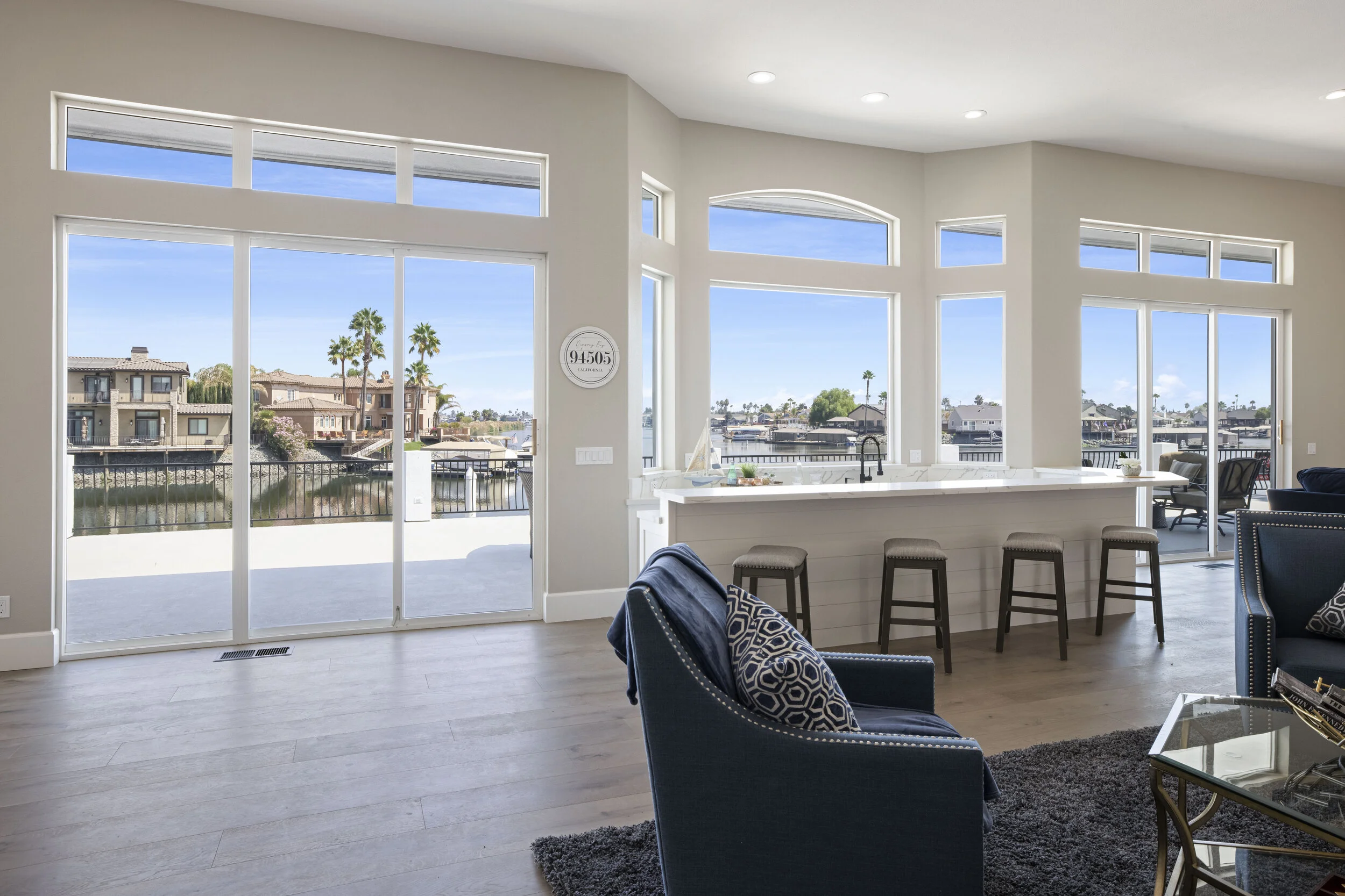 Truly spectacular unique custom single story waterfront home with breathtaking panoramic views on a point lot with approx. 183 feet of water frontage. Sought after eastern exposure. Huge dock with room for yacht, ski boat and more, with room to expand. Can accommodate almost any boat. Waterfront luxury at its finest. Spacious open floor plan features soaring ceilings and tons of natural light. Massive great room features a stunning 72” linear fireplace and a huge bar, leading to an enormous deck, spanning over 2,000 square feet. Perfect for indoor/outdoor living and entertaining. Truly unbeatable views. Spectacular chef’s kitchen features custom shaker cabinets, oversized island, quartz counters, farm sink, top stainless steel appliances and a walk-in pantry. Luxurious primary suite features stunning water views, fireplace and a massive walk-in closet. Exquisite spa-like primary bath features soaking tub, large walk in shower and spectacular water views. Gorgeous new wide plank hardwood flooring. New smart home features include garage door openers, ovens, fridge, security system, smoke/carbon monoxide detectors, ring cameras, NEST thermostat. Oversized 3 car garage (26+ ft deep) with built in cabinets, quartz counters and tall ceilings. Wired for electric car charging. Includes owned solar (50 panels). Beautifully remodeled with no detail overlooked. Don't miss this exquisite dream home! Access to over a thousand miles of delta waterways from your backyard!