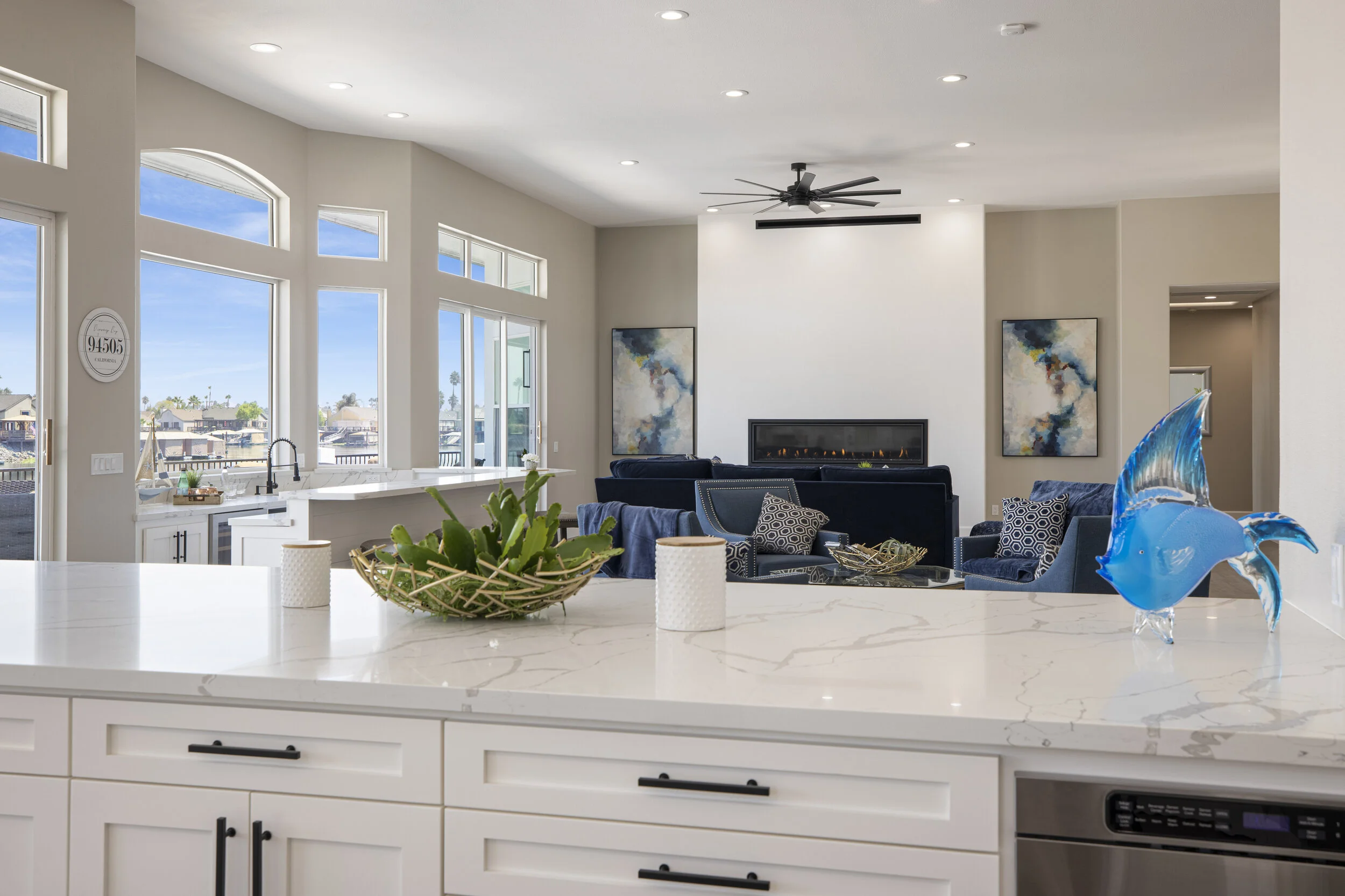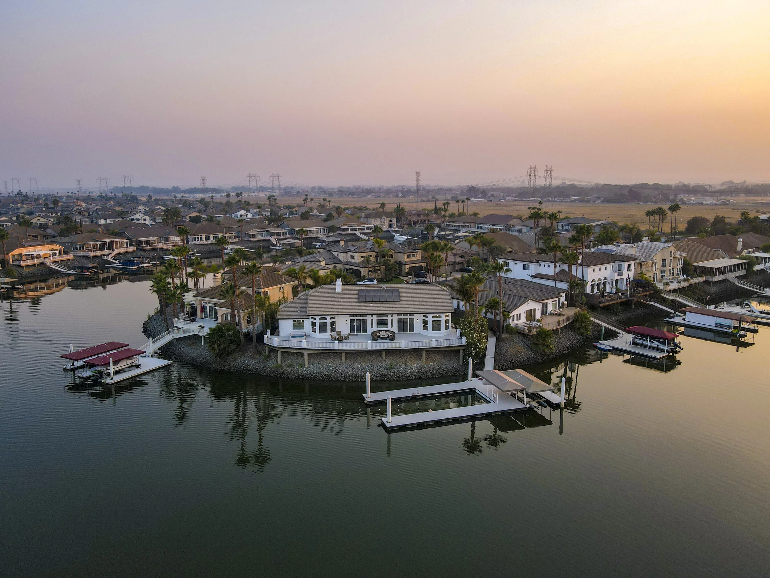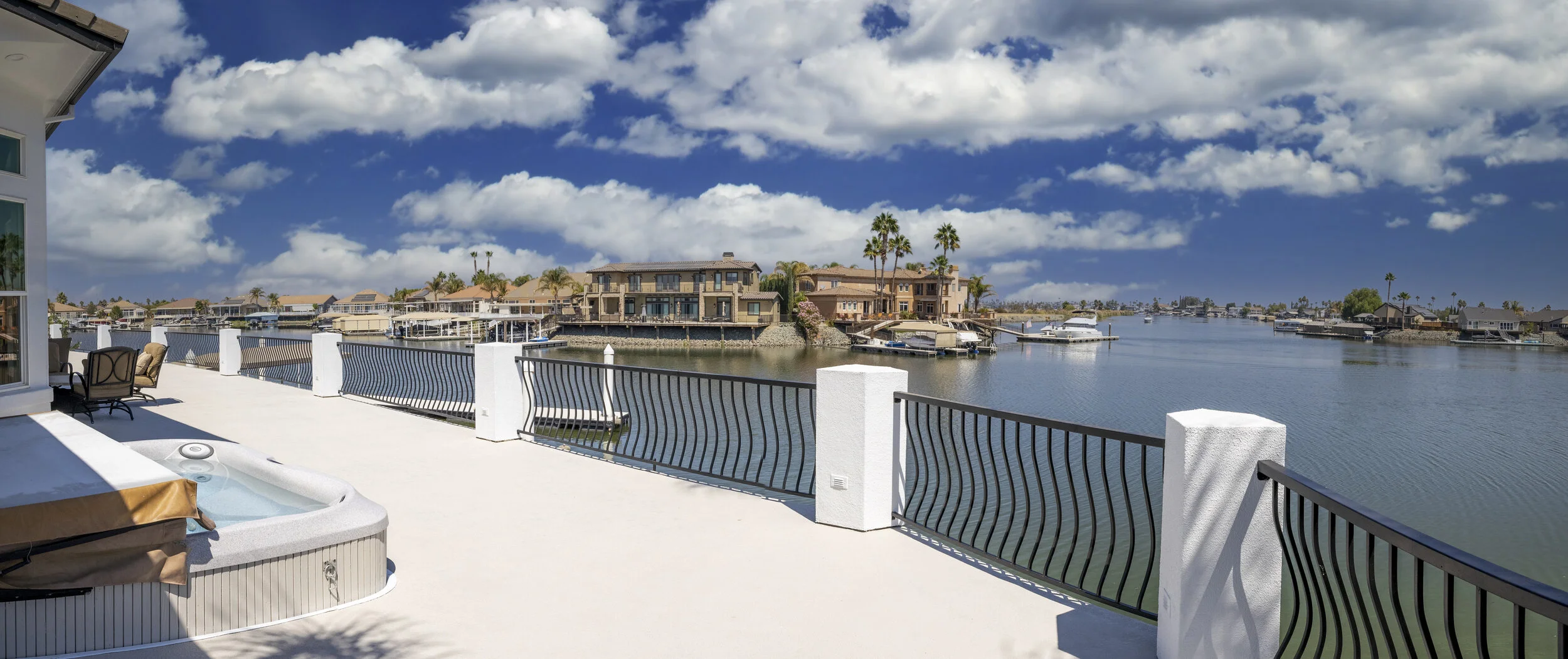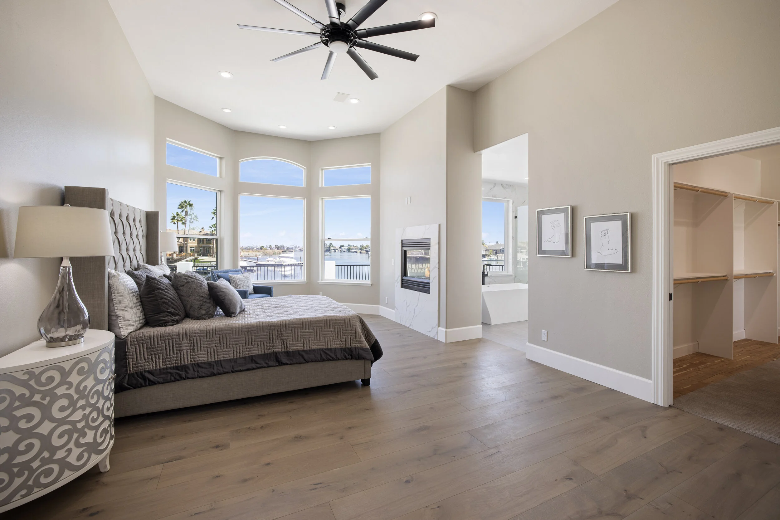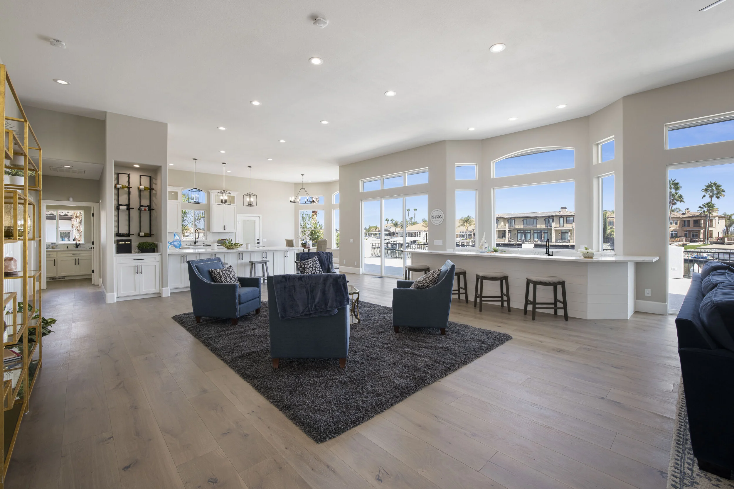 Truly spectacular unique custom single story waterfront home with breathtaking panoramic views on a point lot with approx. 183 feet of water frontage. Sought after eastern exposure. Huge dock with room for yacht, ski boat and more, with room to expand. Can accommodate almost any boat. Waterfront luxury at its finest. Spacious open floor plan features soaring ceilings and tons of natural light. Massive great room features a stunning 72” linear fireplace and a huge bar, leading to an enormous deck, spanning over 2,000 square feet. Perfect for indoor/outdoor living and entertaining. Truly unbeatable views. Spectacular chef’s kitchen features custom shaker cabinets, oversized island, quartz counters, farm sink, top stainless steel appliances and a walk-in pantry. Luxurious primary suite features stunning water views, fireplace and a massive walk-in closet. Exquisite spa-like primary bath features soaking tub, large walk in shower and spectacular water views. Gorgeous new wide plank hardwood flooring. New smart home features include garage door openers, ovens, fridge, security system, smoke/carbon monoxide detectors, ring cameras, NEST thermostat. Oversized 3 car garage (26+ ft deep) with built in cabinets, quartz counters and tall ceilings. Wired for electric car charging. Includes owned solar (50 panels). Beautifully remodeled with no detail overlooked. Don't miss this exquisite dream home! Access to over a thousand miles of delta waterways from your backyard!