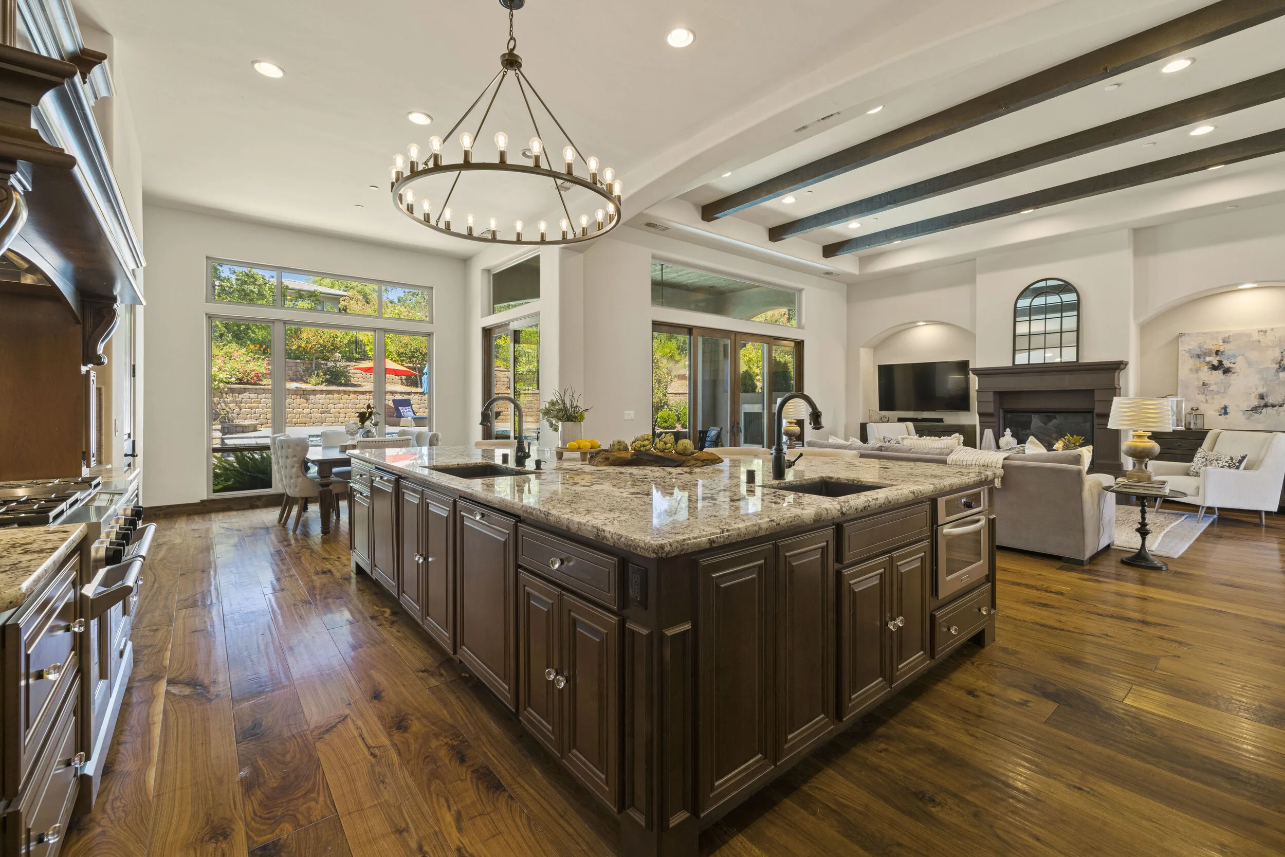 Situated behind the gates of the exclusive Serrano Golf and Country Club sits this gorgeous Santa Barbara-style home. The residence lives like a single story with five bedrooms and five bathrooms on the primary level and a bonus room, full bath, and balcony with spectacular views of the lake upstairs. The chef's kitchen features a beautiful piano island, furniture-grade cabinetry, bullnose granite slab counters, and professional-grade appliances. The open floor plan is an entertainer's dream with direct access to the backyard from the grand living room. The backyard is simply stunning, featuring a covered loggia, sparkling pool with cabana shelf, hot tub, and fire pit. The oversized owner's suite features a large gas fireplace, exposed wood beams, a large walk-in closet, and a spa-like bath with a jacuzzi tub. Quality craftsmanship throughout the home with 9" hand-scraped walnut floors, four fireplaces, solid wood doors, and forged iron railings. Owned Solar!