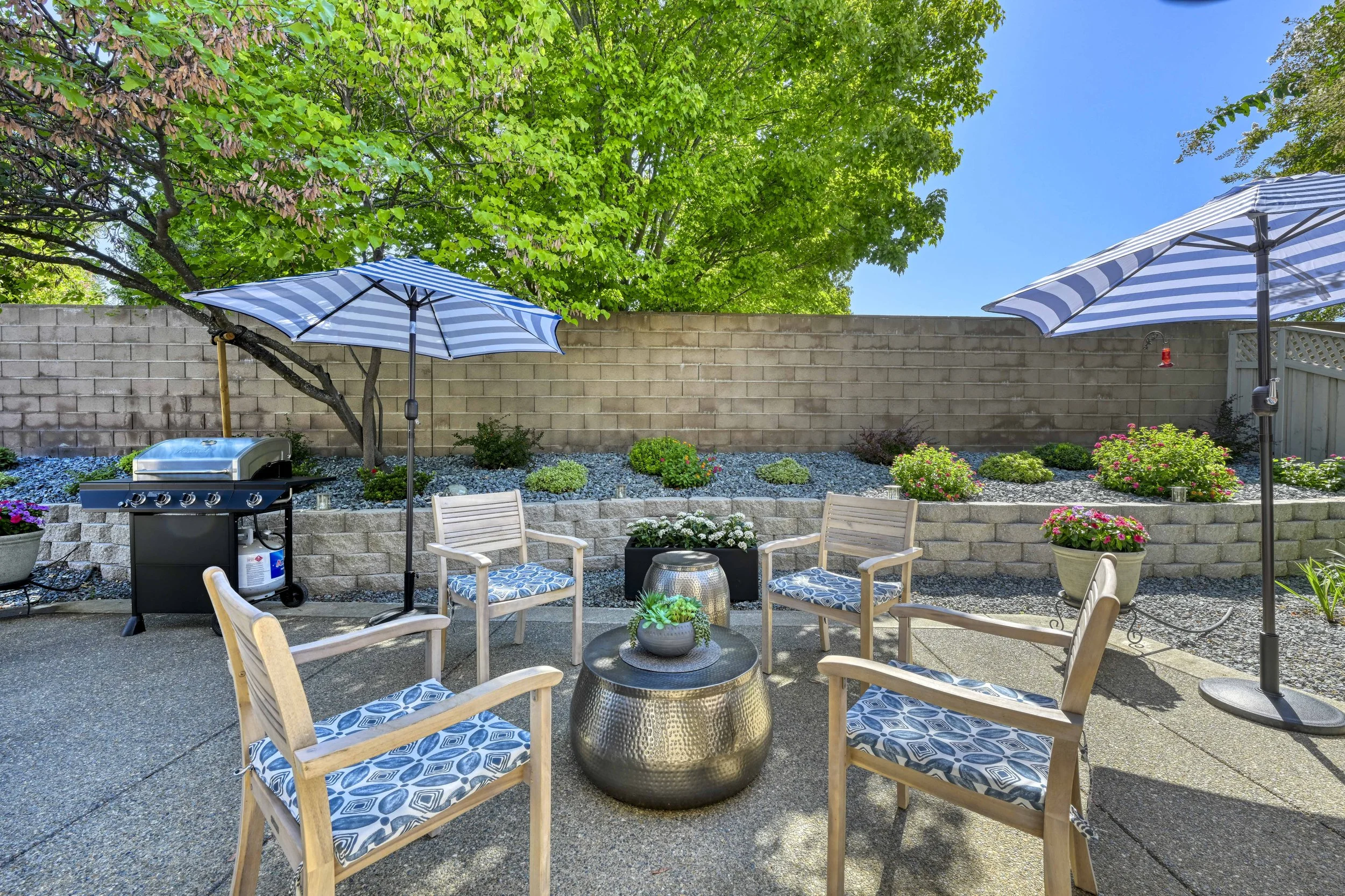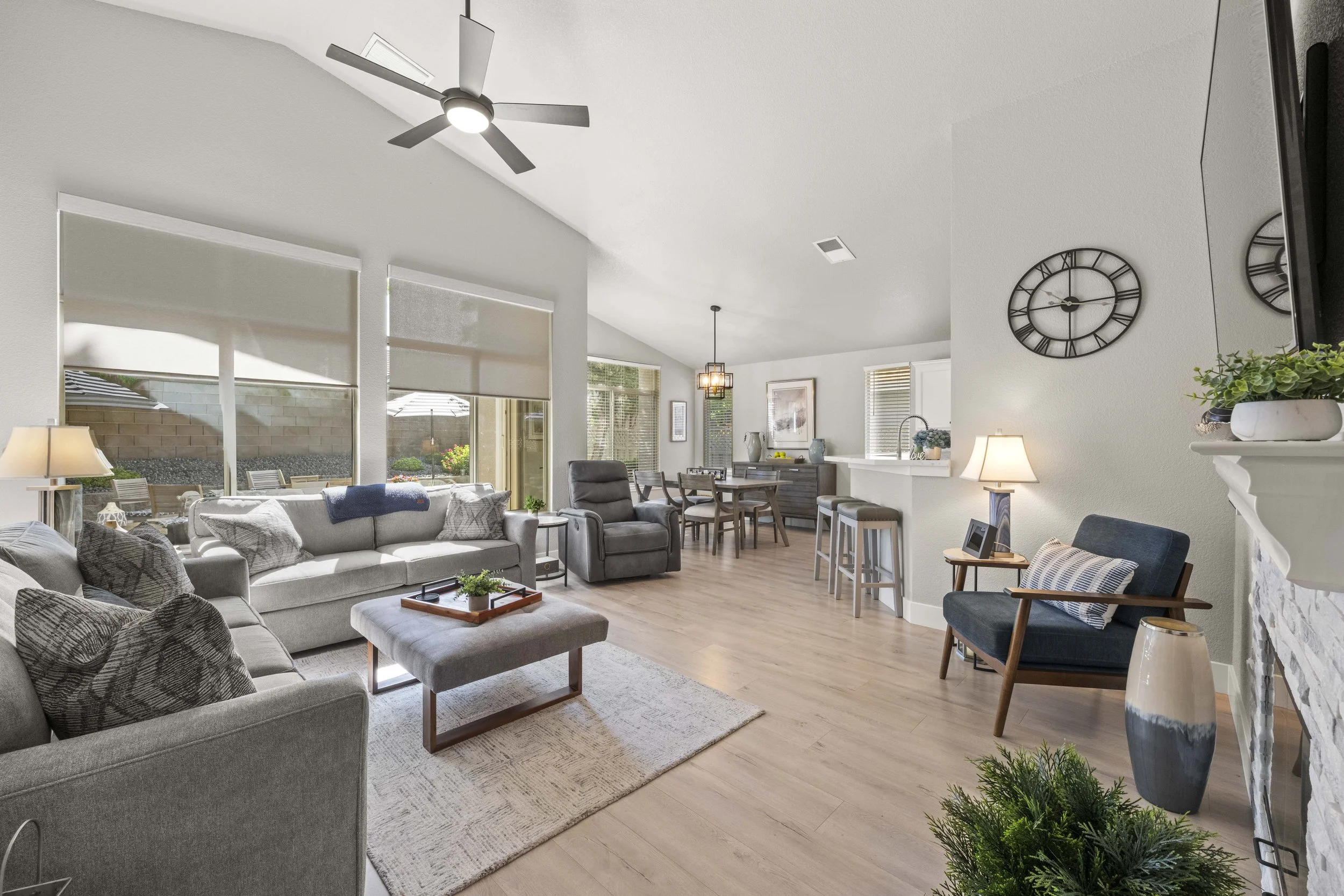 A SHINING GEM IN SUN CITY ROSEVILLE! This desirable 1476 sq ft Country Rose model is a Must See! A truly immaculate home loaded with upgrades, and a standout with move in ready appeal. Inside the home you will find a fully remodeled 2 bedrooms, 2 baths and an office with built-in desk and added wall space. The kitchen is thoughtfully designed offering modern finishes featuring quartz countertops, SS appliances, lg farm style sink, pull out shelves, large pantry closet, dining bar making it a true chef's & entertainers delight. The interior laundry room is complete with washer and dryer and built-in cabinets. Vinyl plank flooring runs continuously throughout the home along with updated wide plank style tile for the bathroom floors. Abundance of natural light floods the home from the many windows and soaring ceilings. Family room has a stack stone fireplace with a flat screen mount above. Window blinds included throughout the home along with remote-controlled window treatments in the family room. Outside the backyard is a private respite with new landscaping including retaining wall and planter beds. New HVAC system installed 7/2024. A truly wonderful place to call home in this oasis for active living!