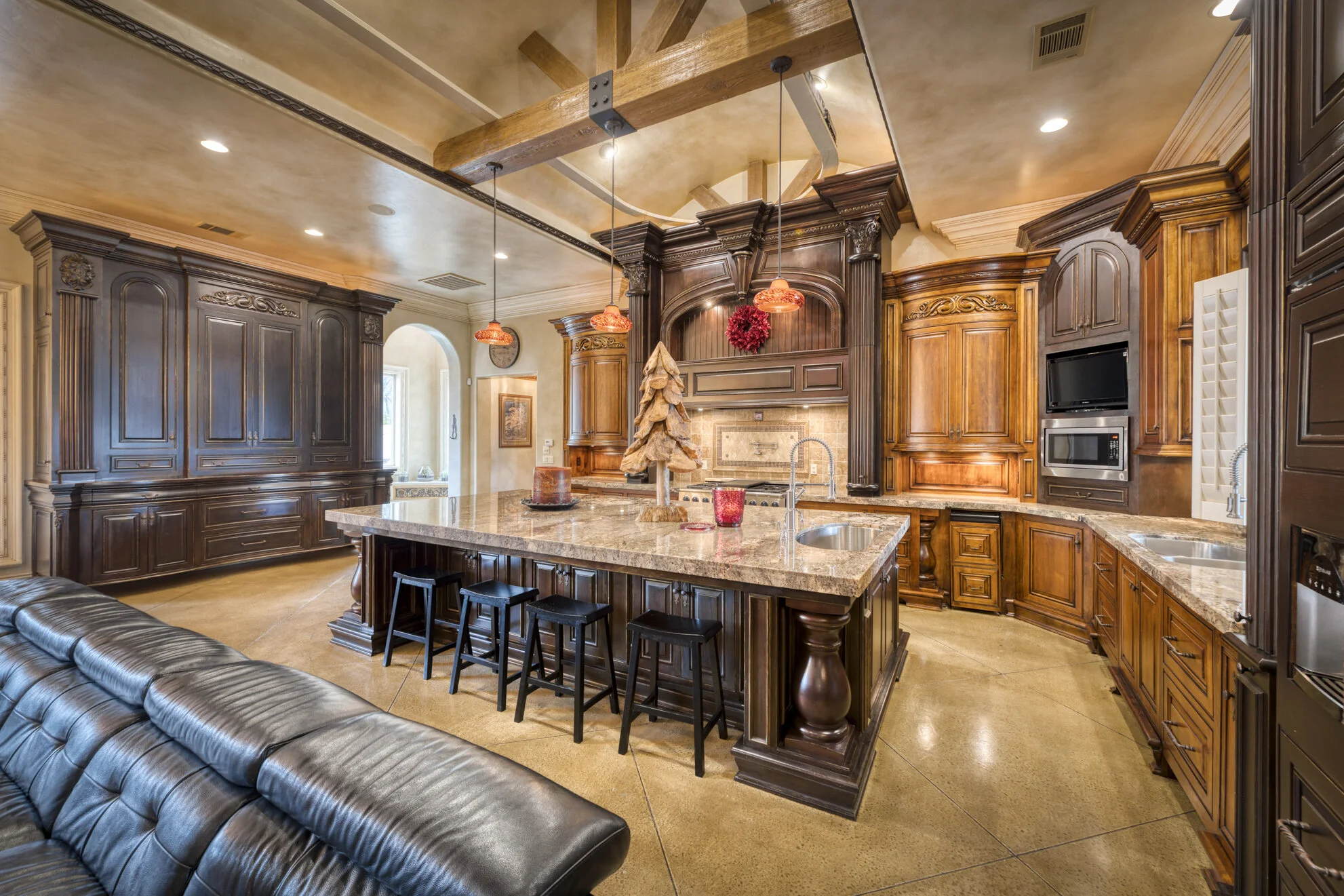 This grand Spanish-style estate provides ample space and exclusive finishes! Sit at the bar of the outdoor kitchen and look out over the sunlit backyard irrigated by a 1/2 miner's inch of water! Park cars and stash your toys in the attached and detached garages. The 3,500+/- SqFt detached garage provides a perfect opportunity to design a new space (conceptual plans attached)! Inside, admire the brilliant use of wood with intricate custom cabinetry throughout! The kitchen features a massive, granite countertop island and numerous built-in appliances. Steps away is a custom bar that would wow even the most seasoned mixologist with two glass-front wine coolers, a sink and a built-in flatscreen. Reside, host, or build your lifestyle!