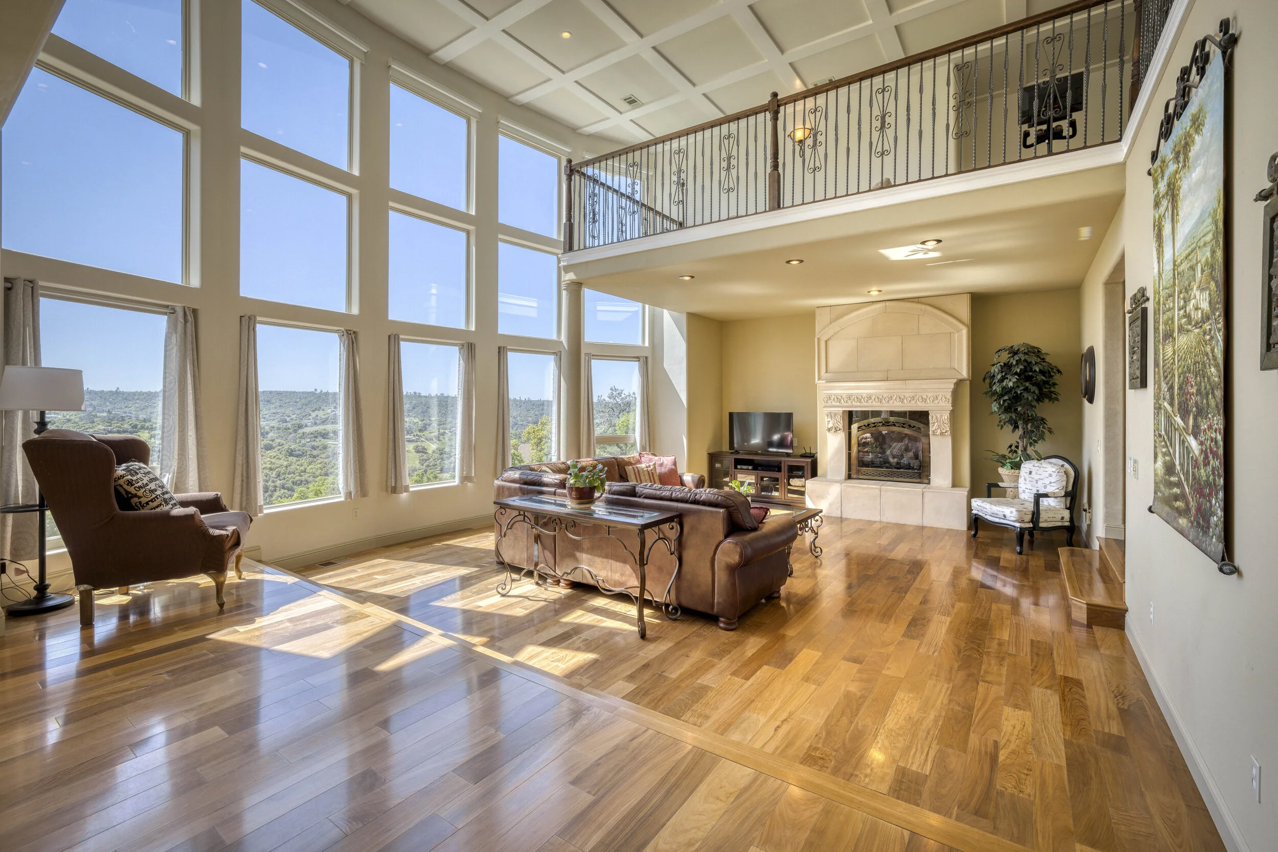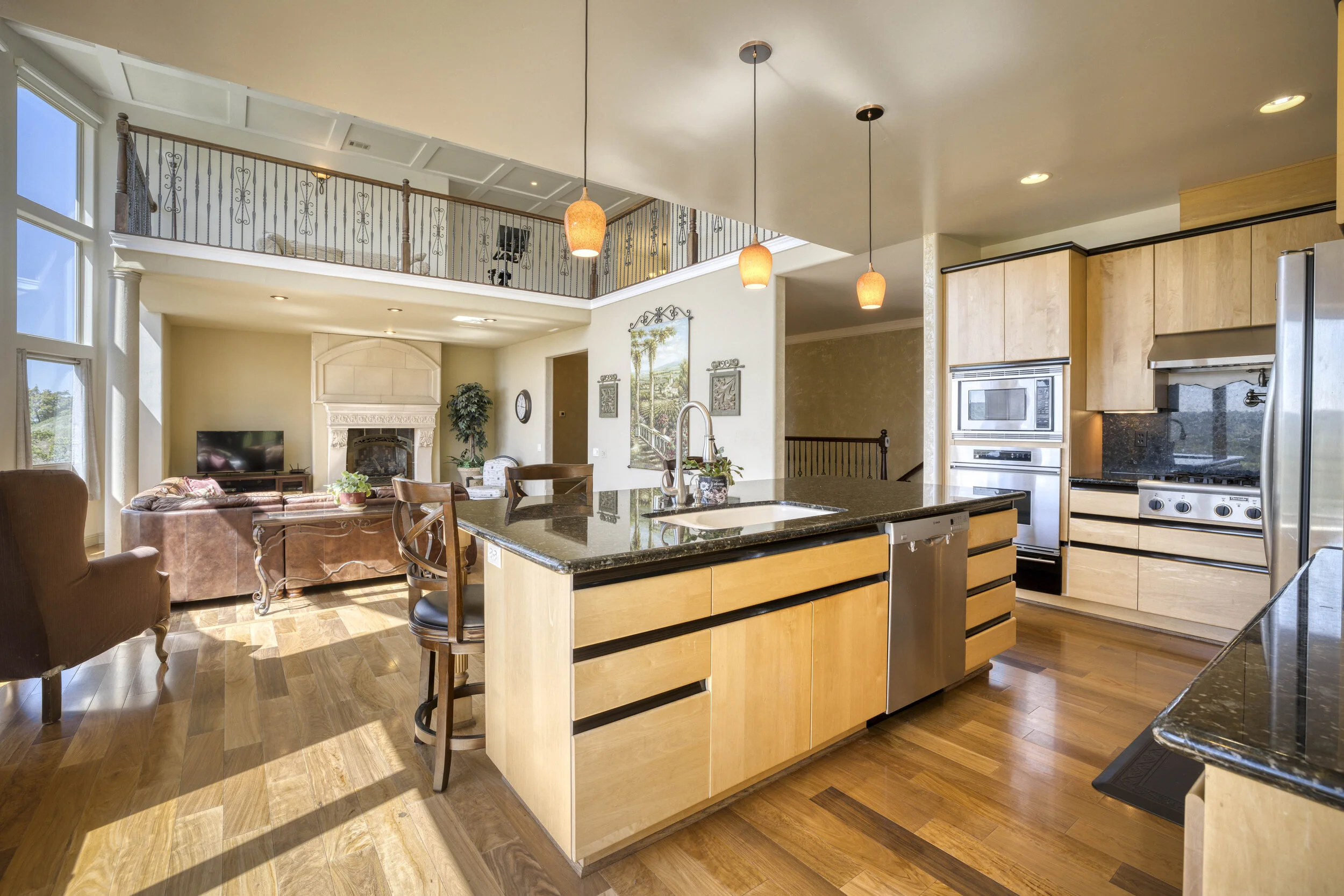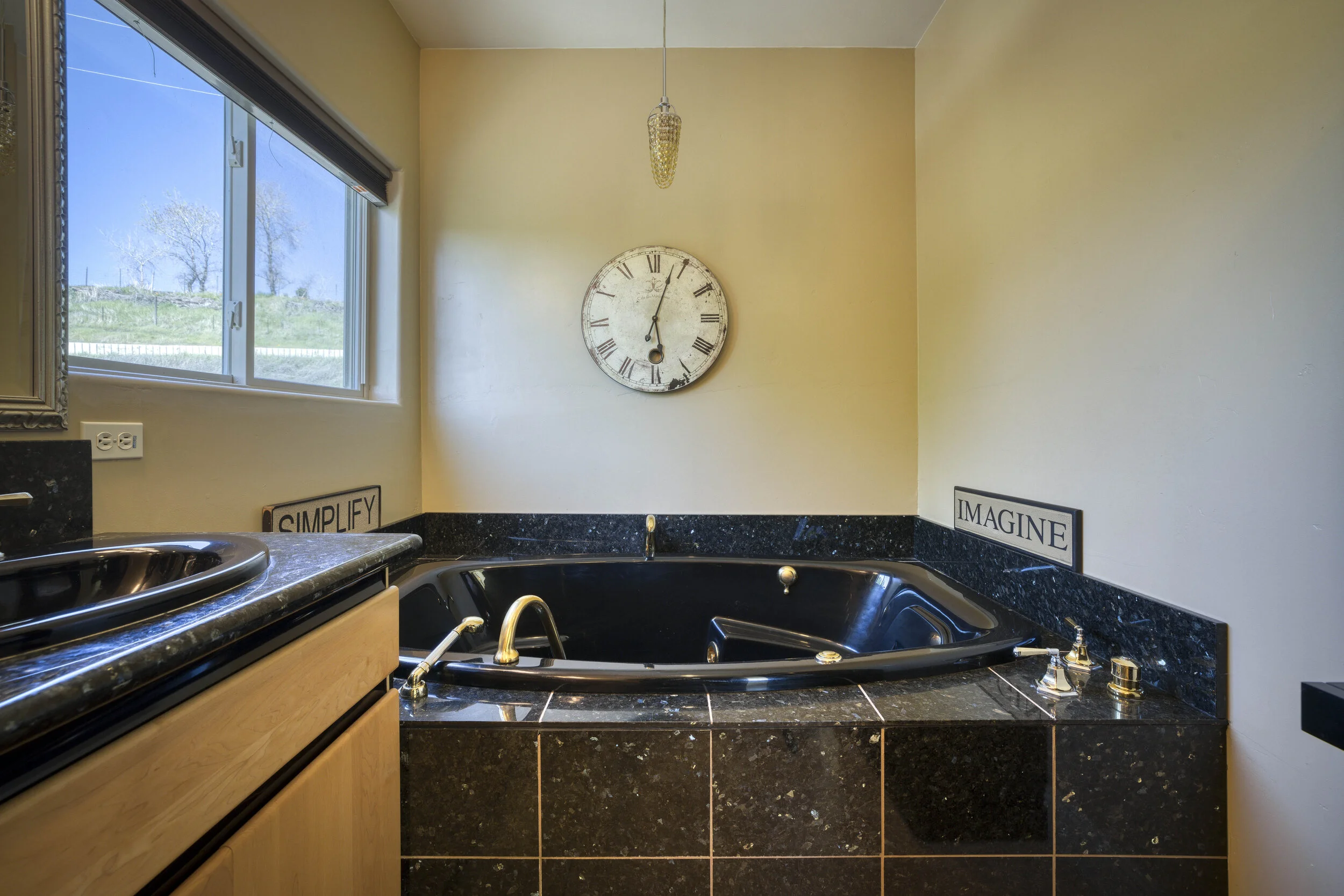 Imagine elegance with just a touch of Old World style flair! This 4 bed/3.5 bath home is defined by its breathtaking view and a conscientious floorplan that maximises it with large floor-to-ceiling windows. The open concept kitchen and family room feel bright, airy, and spacious with a stunning faux marble fireplace and soaring coffered ceilings. In the kitchen, chic modern cabinetry pairs nicely with black granite countertops. Enjoy a custom wine shelf, a wine fridge, and a walk-in pantry. The ground floor master exudes luxury with a warm fireplace, jetted tub, and shower featuring three shower heads! Enjoy a home theatre, private executive office, second master with a private entrance, an oversized loft, and a deck overlooking the property's lush 5+/- acres.